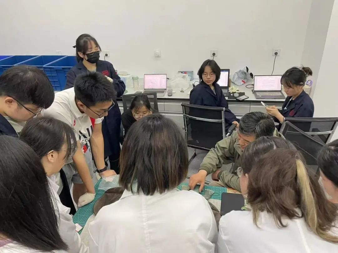 实习期间,曾经在中国三峡博物馆工作过的刘成老师专程来看望同学们,解答他们在修复文物过程中遇到的各种问题。“刘成老师对中国三峡博物馆有着很深厚的感情,他在向我们讲解青铜器病害相关知识、展示了前沿文物三维建模科技的同时,还分享了许多当时他在这里工作的趣事”。徐旖函回忆道。而老师们提供的专业建议也使同学们在工作中更加得心应手。在修复某件马褡裢时,徐旖函思考了很长时间也没有找到一个既能将文物撑起来又不会对其造成损害的方法,于是便积极寻求帮助。“老师并没有直接告诉我如何去做,而是慢慢引导我找到解决问题的办法,这个过程使我对皮革制文物修复的认识更进一层。”