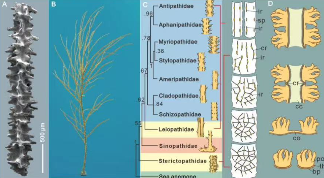 作为黑珊瑚目唯一的化石科,中华黑珊瑚科仅在我国湖北早奥陶世地层被发现。由于表面特征与现生黑珊瑚的差异巨大,其是否能够归属为黑珊瑚目,一直存在较大争议。“通过高分辨率显微CT技术,我们首次完整重建了黑珊瑚化石的三维内部结构,为确认其分类地位提供了关键证据。”乐鱼网页版页面登录博士生郝文静介绍,新发现的2个中奥陶世的黑珊瑚化石种,在演化上属于早奥陶世黑珊瑚化石与现代黑珊瑚之间的过渡形态类型,确认了硬黑珊瑚科属于黑珊瑚目。