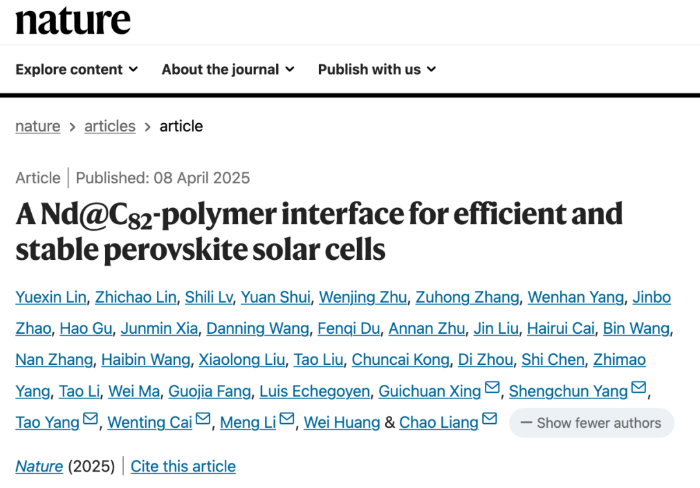 该研究成果以《Nd@C82-聚合物界面应用于高效稳定钙钛矿太阳能电池》(“A Nd@C82-polymer interface for efficient and stable perovskite solar cells”)为题于4月8日在《自然》(Nature)期刊上在线发表。西安交通大学物理学院博士研究生林越辛、水源、朱文静,西安交通大学化学学院硕士研究生吕世丽,福建农林大学林智超博士为论文共同第一作者;物理学院梁超研究员、杨生春教授、杨涛研究员,化学学院蔡文婷研究员(丁书江教授团队),澳门大学邢贵川教授,河南大学李萌教授为论文通讯作者;西安交通大学物理学院为本论文第一完成单位。
