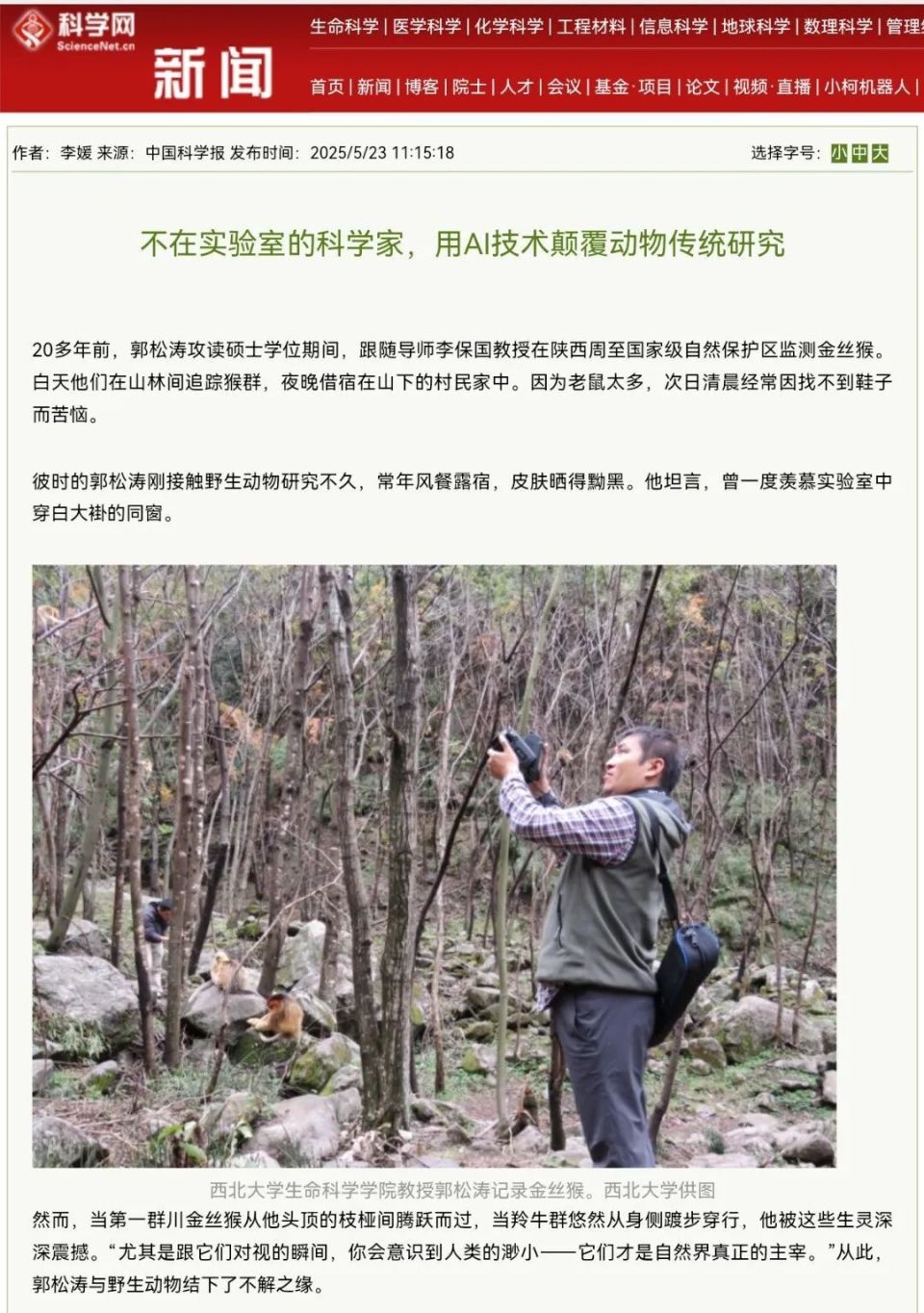 “我们所研究的群体数量较大,如何区分每一个个体,‘猴脸识别’技术就发挥了重要作用。并且,在分辨出个体的基础上,才能对其个体的行为识别进行连贯而系统的分析。”郭松涛把猴脸识别技术比做行为识别技术的铺垫。通过这两种技术的结合,研究人员能够自动化检测和测量野生动物全周期的行为特征。