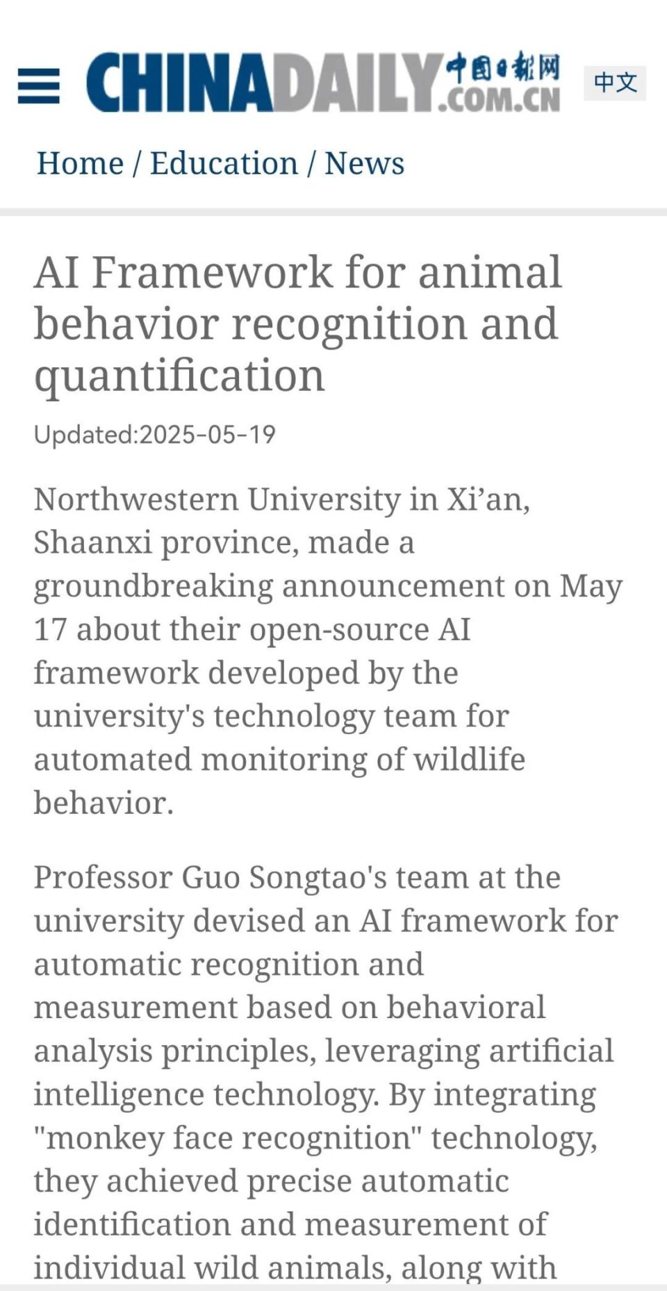 当框架能够精准捕捉动物们的“日常节奏”,为每一个动物个体建立行为档案,不仅为此后的科研建立数据库,也为普通人了解动物的内心世界提供了一个窗口。演示中,团队成员、硕士生王詹打开手机小程序,对准电脑屏幕上的一张猴子照片按下快门,不到5秒钟,结果就出来了。“它叫‘洋葱’,可信度85%。”刘洋说。随后的演示图像中,“洋葱”的整个身体被打上若干个点位标记,分析这些点位的运动规律,就能深度解析其全生命周期的行为意图。