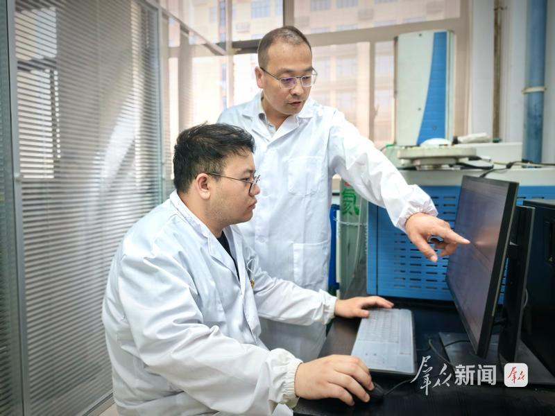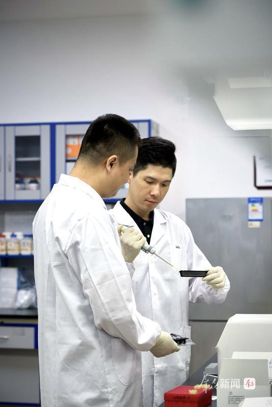5月27日,第十三届陕西青年科技奖获得者、西安金磁纳米生物技术有限公司董事长张秦鲁(右)与科研团队成员检测氧化型低密度脂蛋白临床样本。张秦鲁带领团队致力于新型纳米材料和体外诊断创新技术的研发和成果转化,取得了40余项发明专利。公司的诸多科技成果填补了省内乃至国内的相关领域空白。群众新闻记者 郭诗梦摄