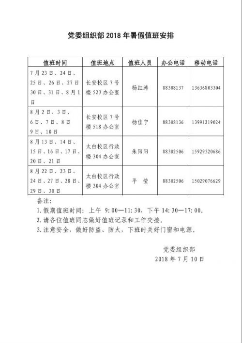 党委组织部2018年暑假值班安排