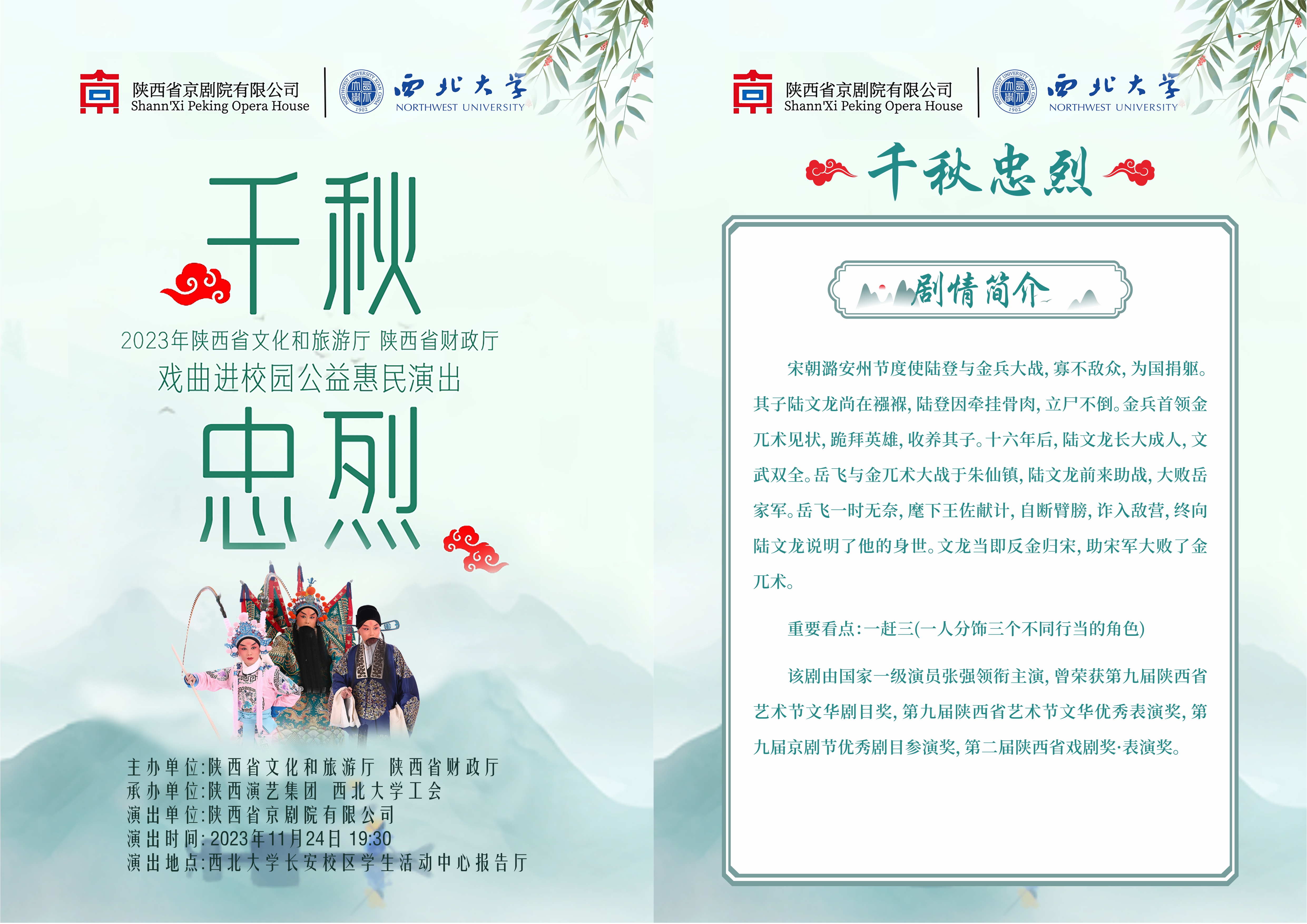 关于举办戏曲进校园公益惠民演出的通知 作者:校工会 编辑:罗娜 时间:2023-11-21 各基层分会: 为丰富校园文化生活,弘扬民族传统文化,传承京剧国粹艺术,校工会将于11月24日晚在长安校区学生活动中心报告厅举办戏曲进校园公益惠民演出活动。 请各分会于11月22日至校工会办公室(长安校区7号教学楼7217)领取演出门票。 演出剧目:京剧《千秋忠烈》 演出时间:2023年11月24日19:30 演出地点:乐鱼网页版页面登录长安校区学生活动中心 联 系 人:田霖 联系电话:88302521 校工会 2023年11月21日
