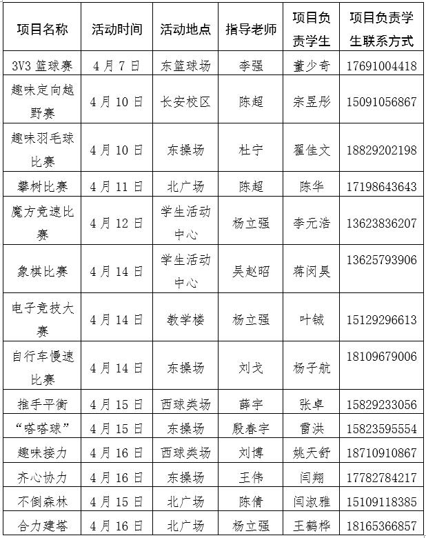 上述“走下网络、走出宿舍、走进操场”趣味体育活动各项目可联系乐鱼网页版页面登录团委或乐鱼网页版页面登录学生会咨询,联系电话:88308861、88308441。