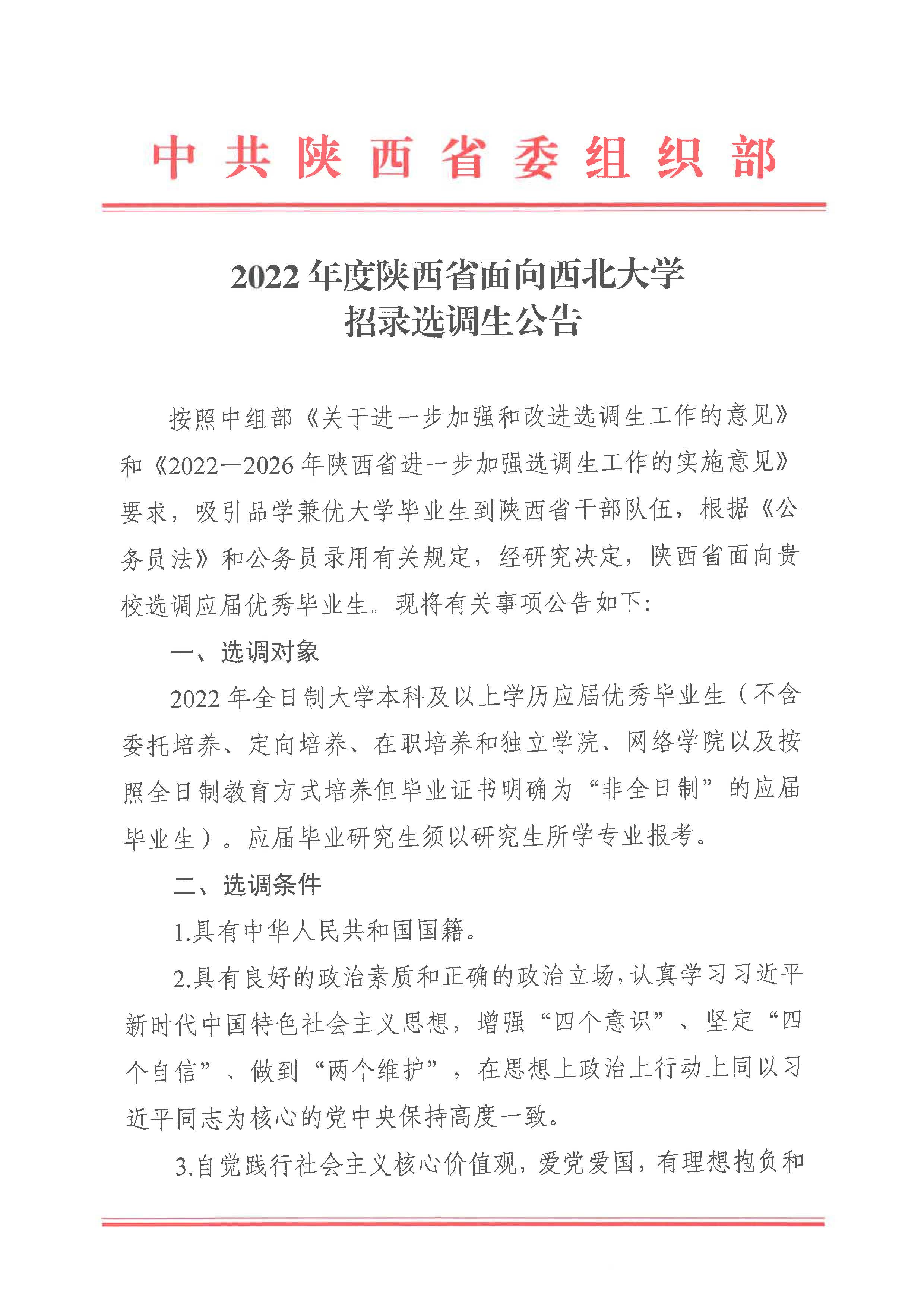 2022年度陕西省面向乐鱼网页版页面登录招录选调生公告