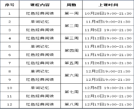 2021年10月28日至12月17日,具体上课时间详见下表: