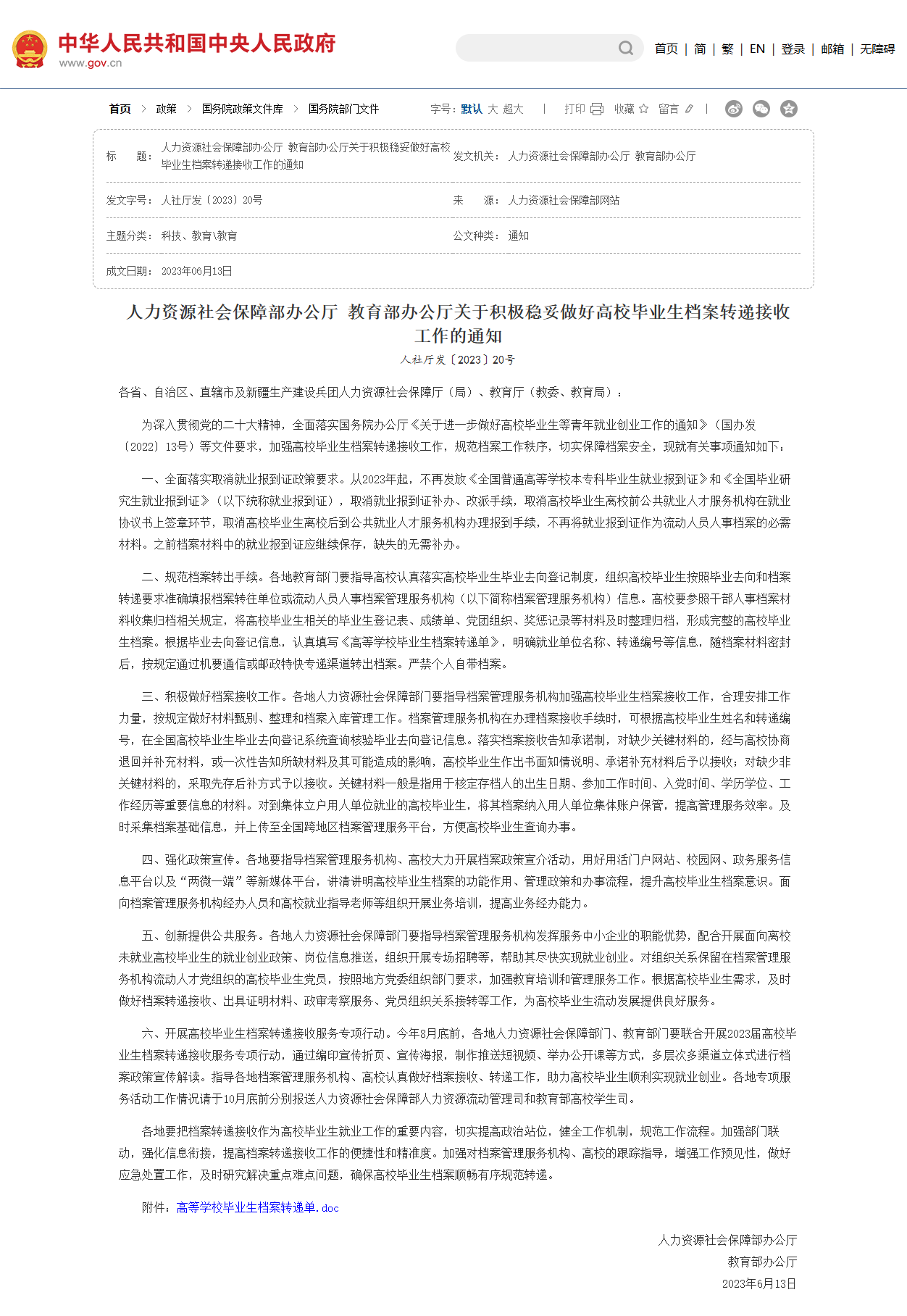 2023年6月13日,人力资源社会保障部办公厅、教育部办公厅联合发布《关于积极稳妥做好高校毕业生档案转递接收工作的通知》,按照通知第二点文件要求,规范档案转出手续,将高校毕业生相关的毕业生登记表、成绩单、党团组织、奖惩记录等材料及时整理归档,形成完整的高校毕业生档案后,按规定通过机要通信或邮政特快专递渠道转出档案。同时由于前期文件要求,一般高校毕业生档案不再通过机要通信的方式来转递。