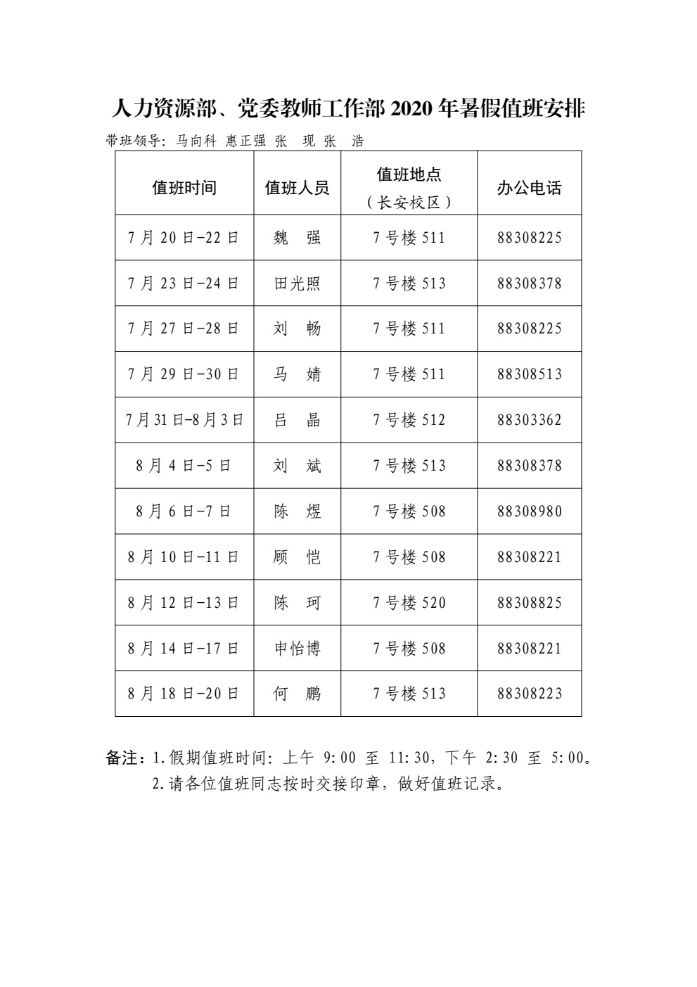 人力资源部 党委教师工作部2020年暑假值班安排