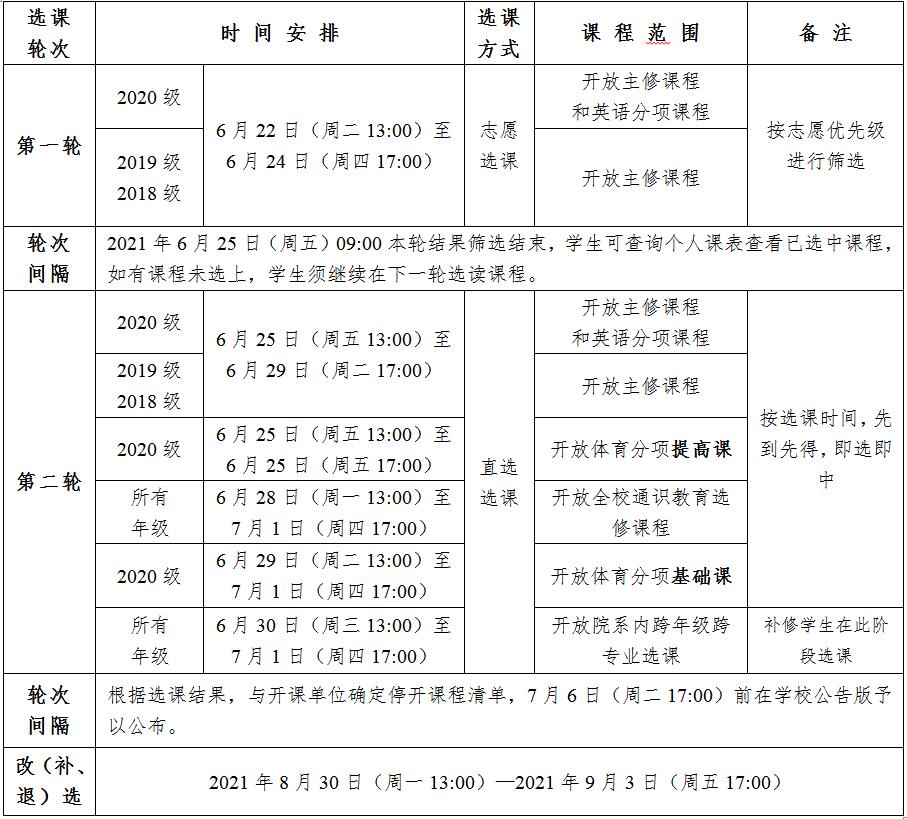 2021—2022学年第一学期课程选课分为正选和改(补、退)选。正选在2021年6月22日(13:00)—2021年7月1日(17:00)进行,分为两轮。改(补、退)选在2021年8月30日(13:00)—2021年9月3日(17:00)进行。现将具体事宜安排如下: