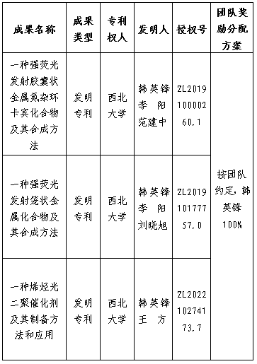 按照《乐鱼网页版页面登录促进科技成果转化实施办法》(西大科〔2019〕5号)相关规定,拟对乐鱼网页版页面登录化学与材料科学学院韩英锋教授作为成果负责人的3项发明专利权实施转化,现将相关信息公示如下: