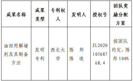 按照《乐鱼网页版页面登录促进科技成果转化实施办法》(西大科〔2019〕5号)相关规定,拟对我校化学与材料科学学院陈邦高级工程师作为成果负责人的1项发明专利权实施转化,现将相关信息公示如下: