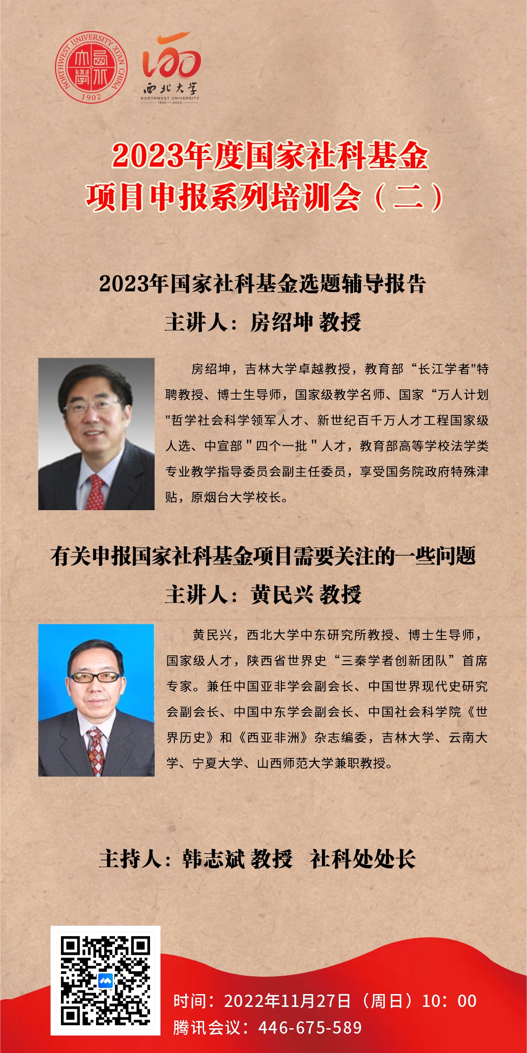 关于召开2023年度国家社科基金项目申报系列培训会(二)的通知 作者:社科处 编辑:黄心一 时间:2022-11-23 时间:2022年11月27日(星期日)上午10:00 地点:腾讯会议446 675 589 参会人员: (1)人文社科学院(所、中心)主管科研院长(所长、主任)及科研秘书 (2)2023年度国家社科基金项目申请人 (3)有意向申报哲学社会科学研究项目的相关教师 培训内容: (1)2023年国家社科基金选题辅导报告(房绍坤教授) (2)有关申报国家社科基金项目需要关注的一些问题(黄民兴教授) 社科处 2022年11月23日