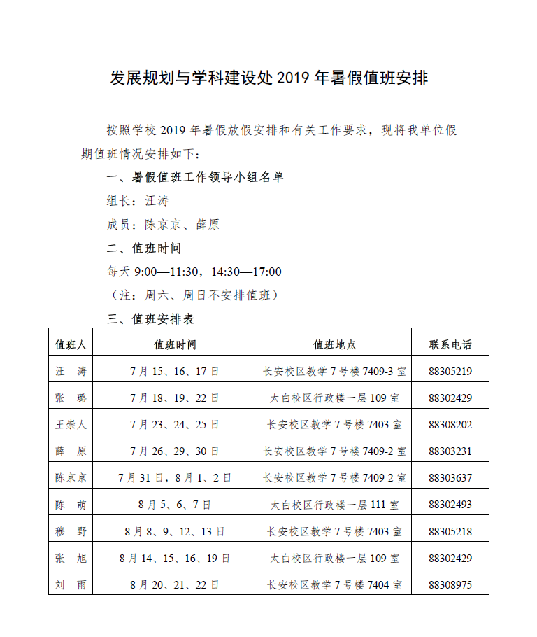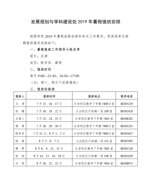 发展规划与学科建设处2019年暑假值班安排