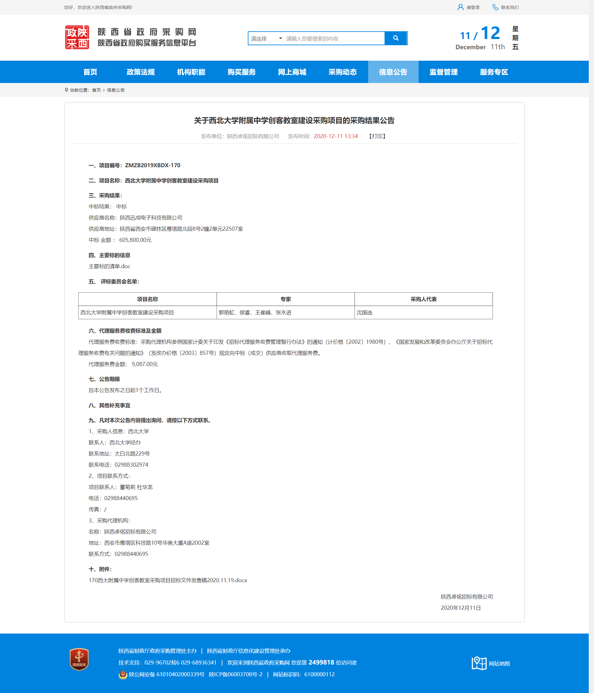 关于乐鱼网页版页面登录附属中学创客教室建设采购项目的采购结果公告 作者: 编辑:薛利娟 时间:2020-12-11 原公告地址:http://ccgp-shaanxi.gov.cn/notice/noticeDetail.do?noticeguid=8a85be3275d5d5c2017650494fb1060f