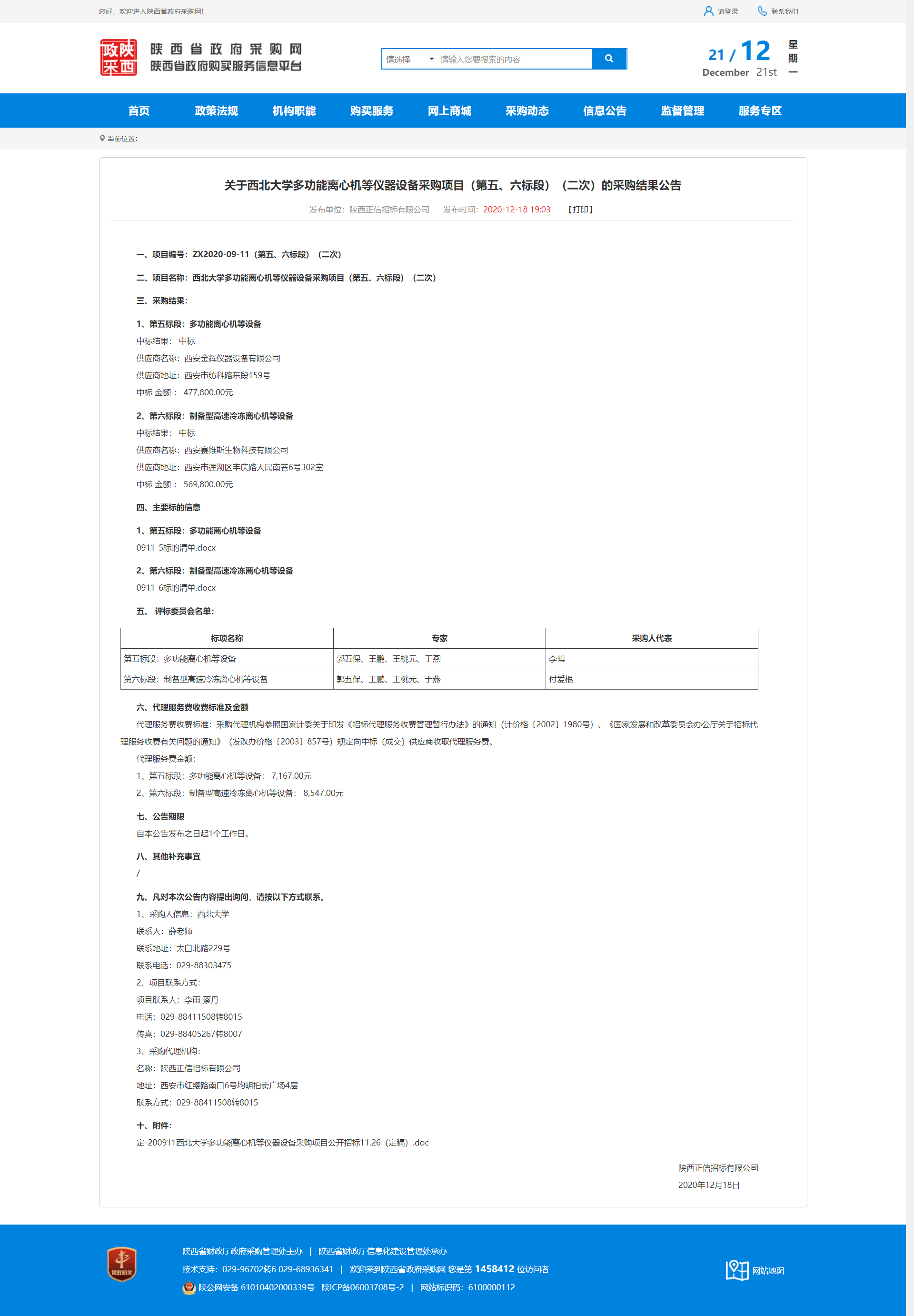 关于乐鱼网页版页面登录多功能离心机等仪器设备采购项目(第五、六标段)(二次)的采购结果公告 作者: 编辑:薛利娟 时间:2020-12-21 原 原公告地址:http://www.ccgp-shaanxi.gov.cn/notice/noticeDetail.do?noticeguid=8a85be34765f9eac01767583a6a72bec