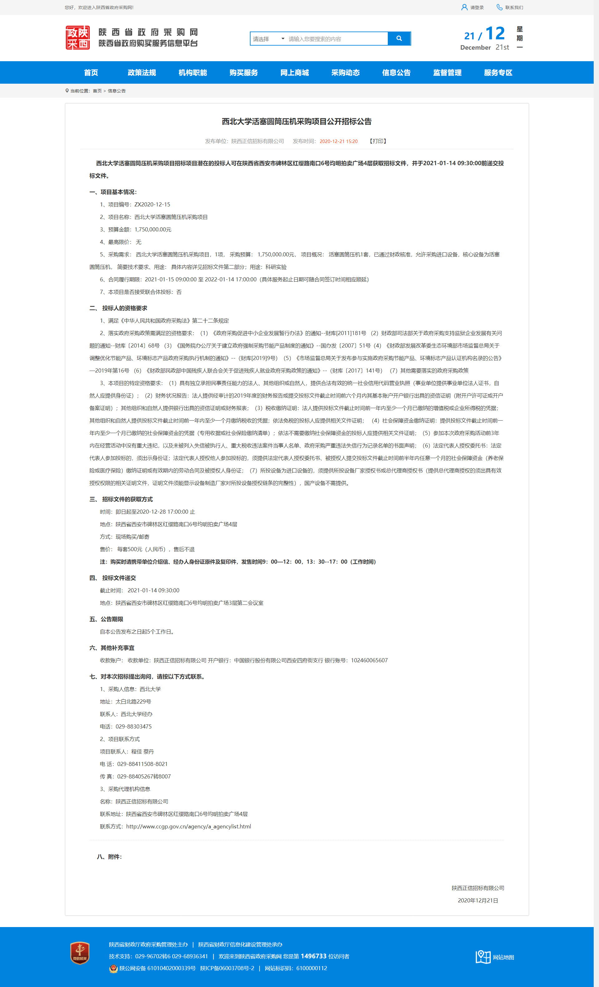 乐鱼网页版页面登录活塞圆筒压机采购项目公开招标公告 作者: 编辑:薛利娟 时间:2020-12-21 原公告地址:http://www.ccgp-shaanxi.gov.cn/notice/noticeDetail.do?noticeguid=8a85be33765f9dd0017683bb212e48f1