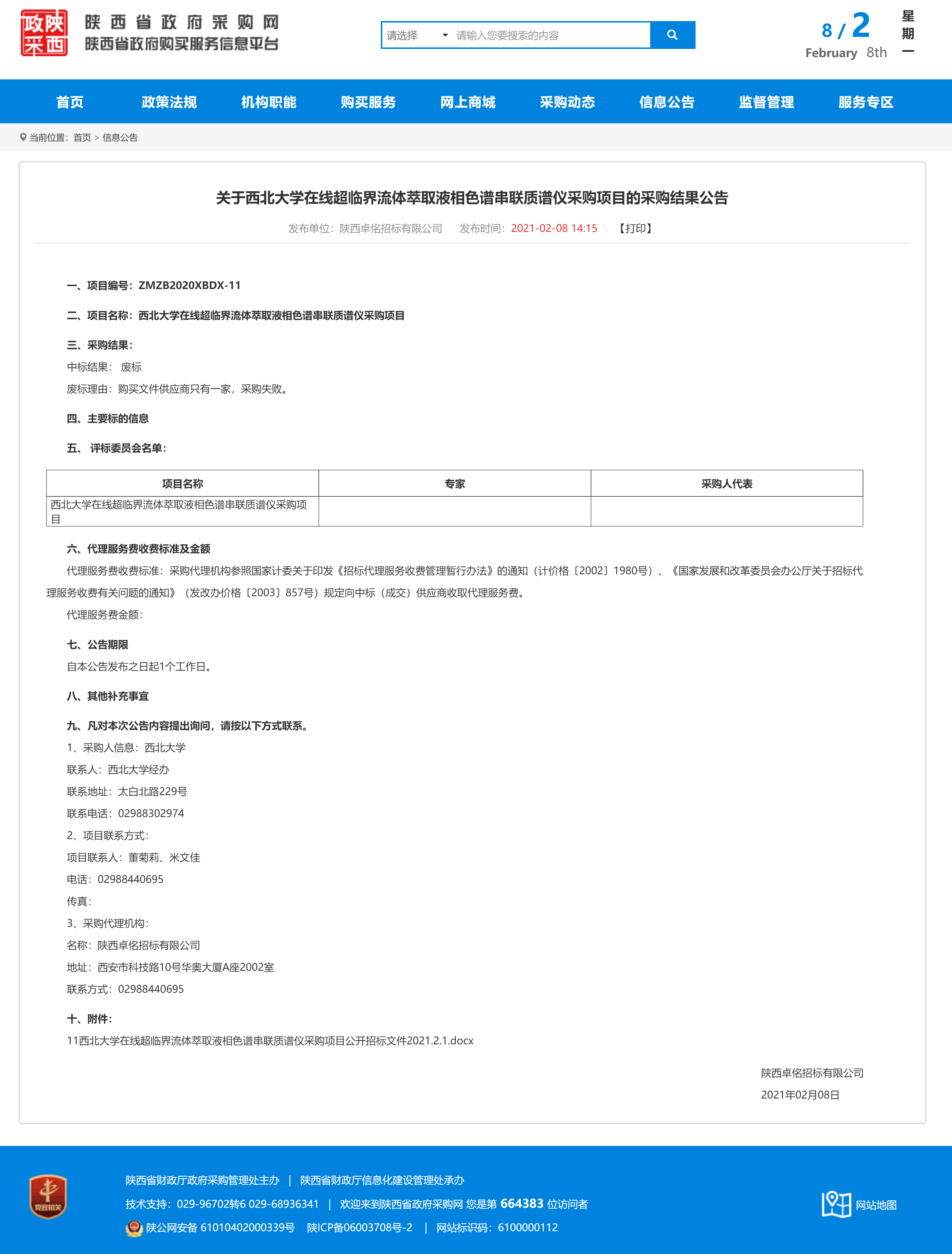 乐鱼网页版页面登录在线超临界流体萃取液相色谱串联质谱仪采购项目的采购结果公告