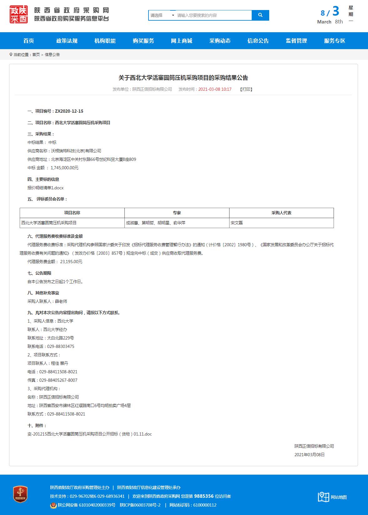 乐鱼网页版页面登录活塞圆筒压机采购项目的采购结果公告