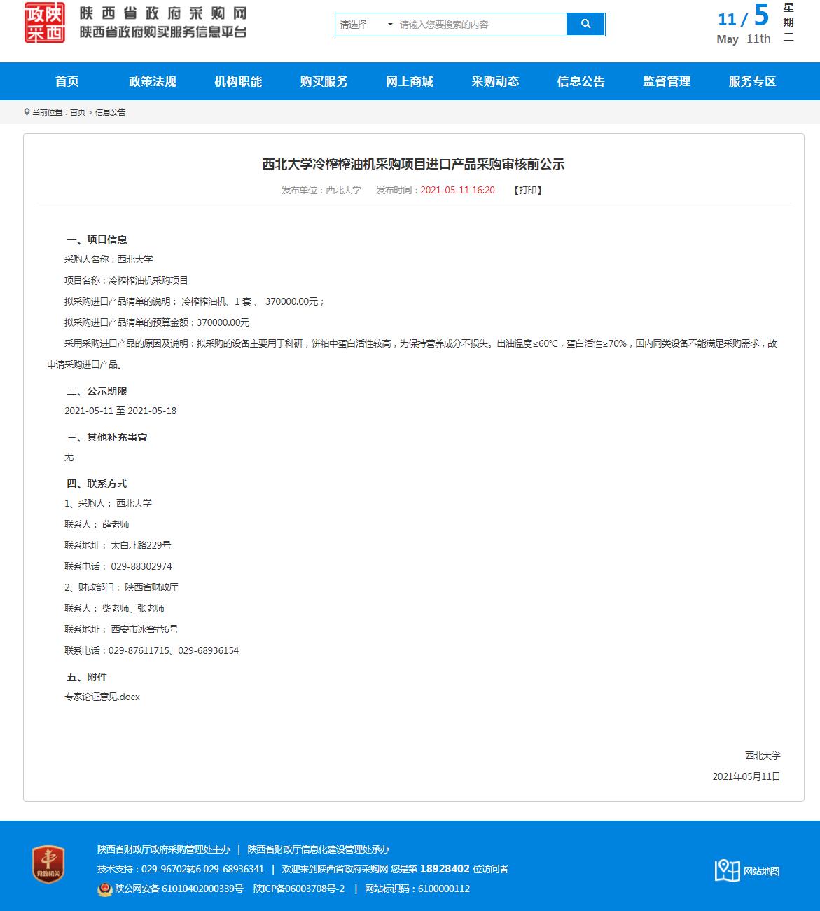 乐鱼网页版页面登录冷榨榨油机采购项目进口产品采购审核前公示