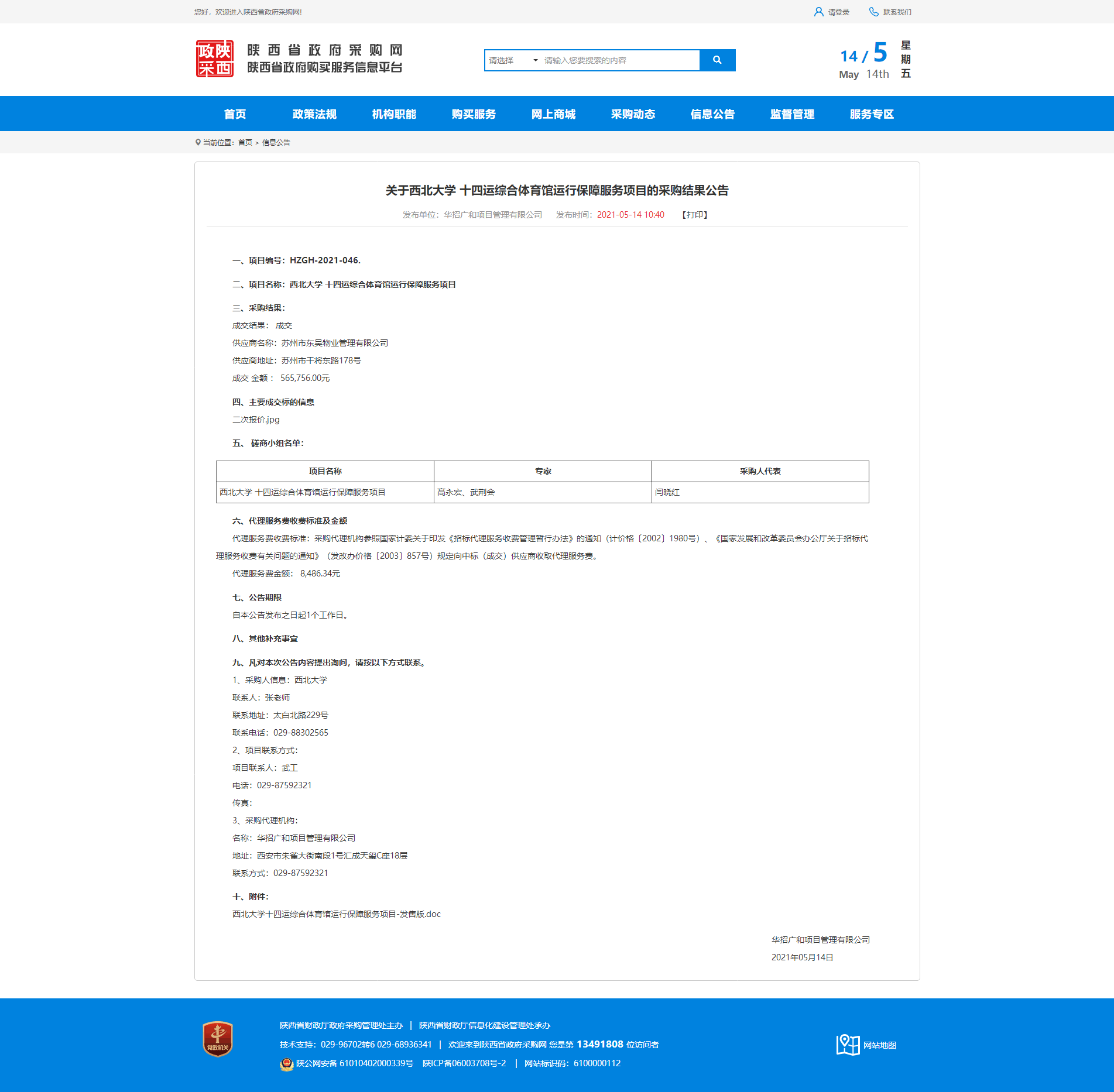 关于乐鱼网页版页面登录十四运综合体育馆运行保障服务项目的采购结果公告