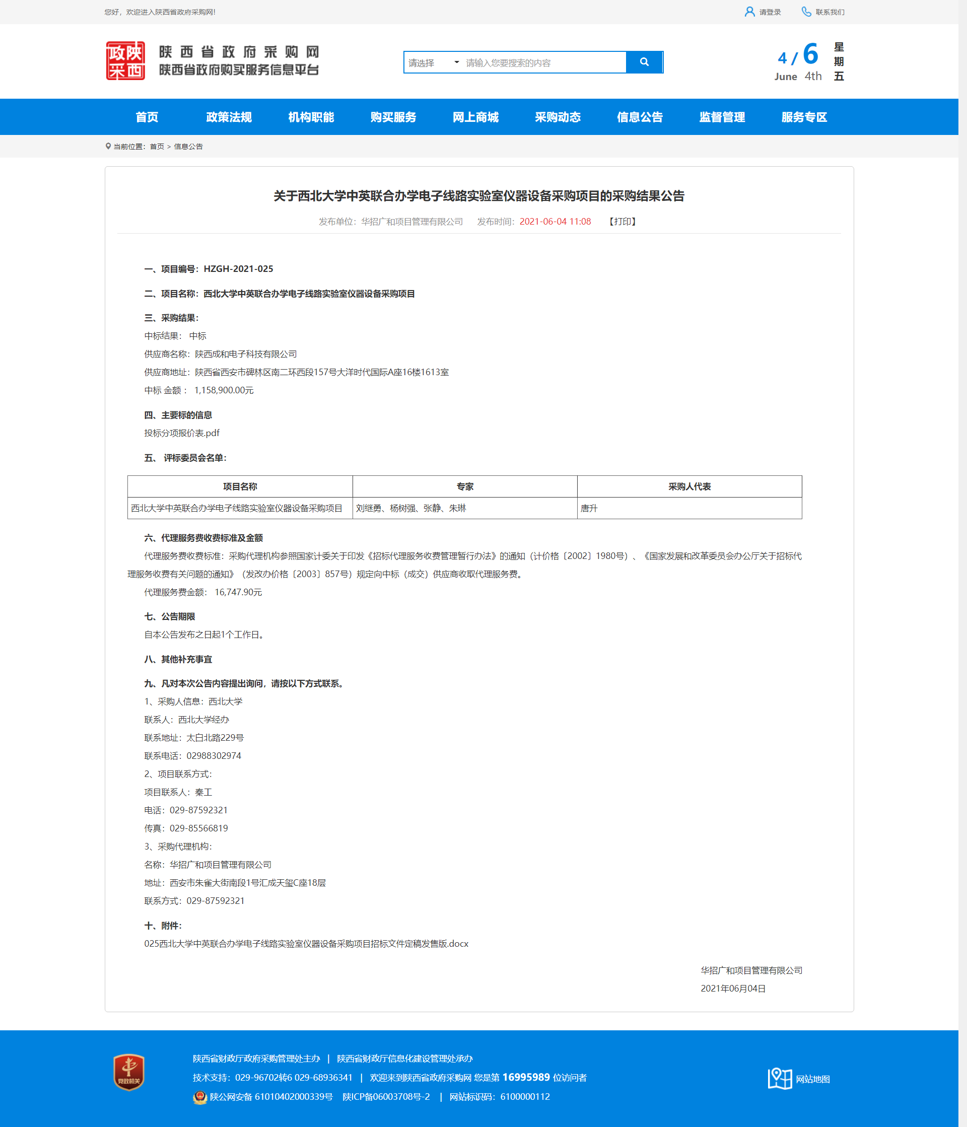 关于乐鱼网页版页面登录中英联合办学电子线路实验室仪器设备采购项目的采购结果公告 作者: 编辑:薛利娟 时间:2021-06-04 原公告地址:http://ccgp-shaanxi.gov.cn/notice/noticeDetail.do?noticeguid=8a85be32791b87da0179d4f9ca5a7372