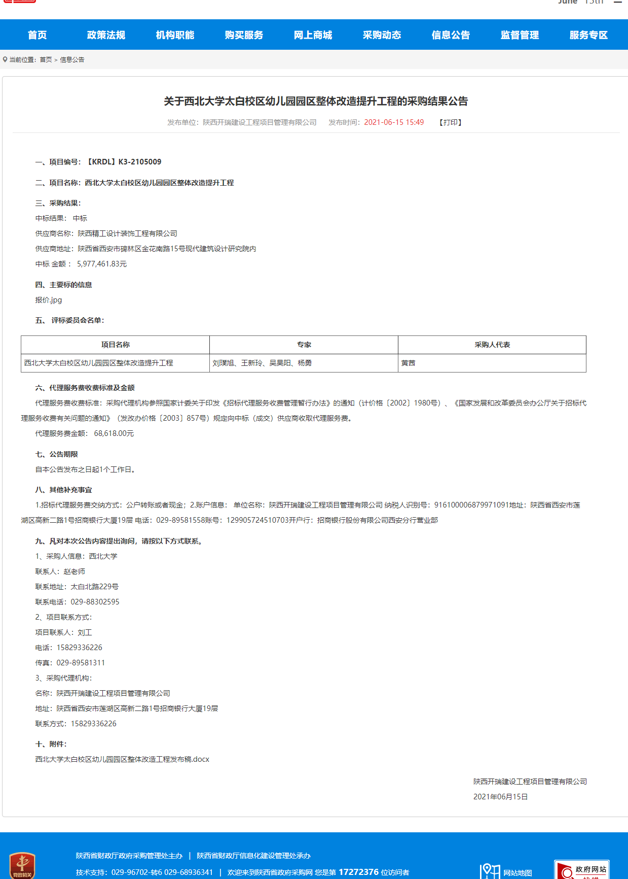 乐鱼网页版页面登录太白校区幼儿园园区整体改造提升工程的采购结果公告