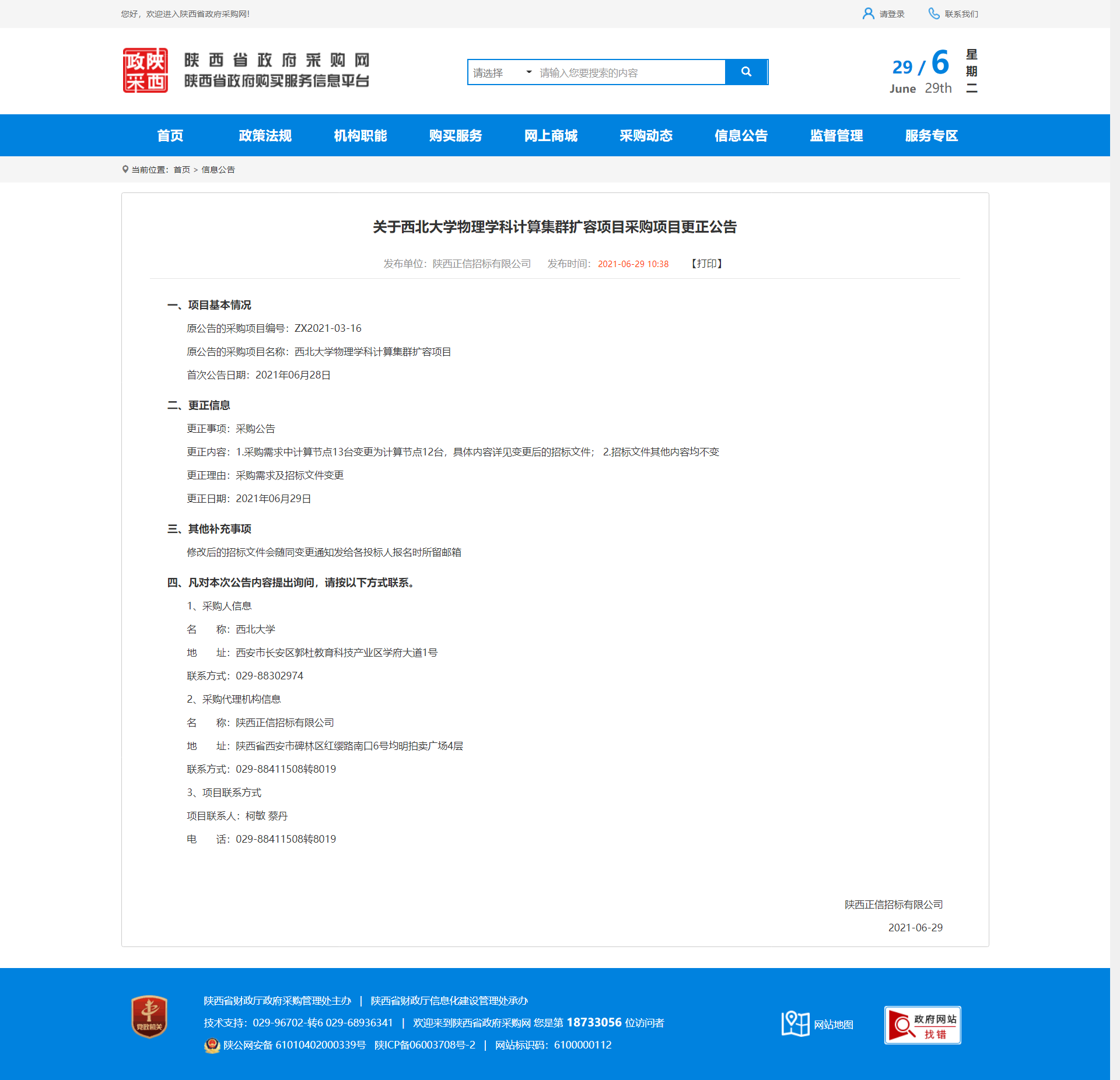 乐鱼网页版页面登录物理学科计算集群扩容项目采购项目更正公告 作者: 编辑:采购与招标办公室 时间:2021-06-29 原公告地址:http://www.ccgp-shaanxi.gov.cn/notice/noticeDetail.do?noticeguid=8a85be33791baa0f017a529f9f2b60b3