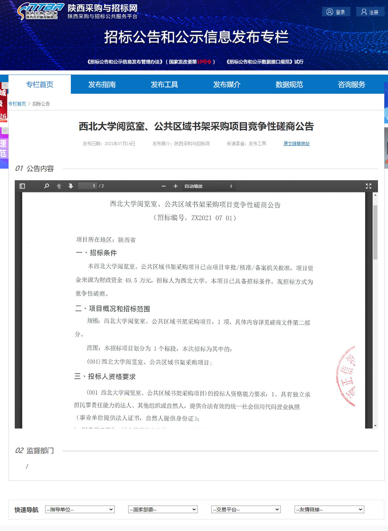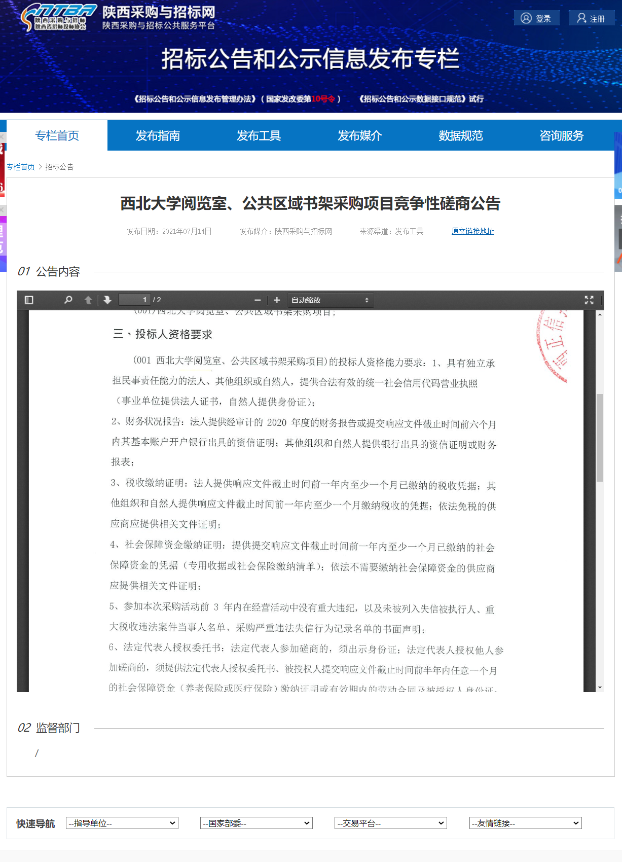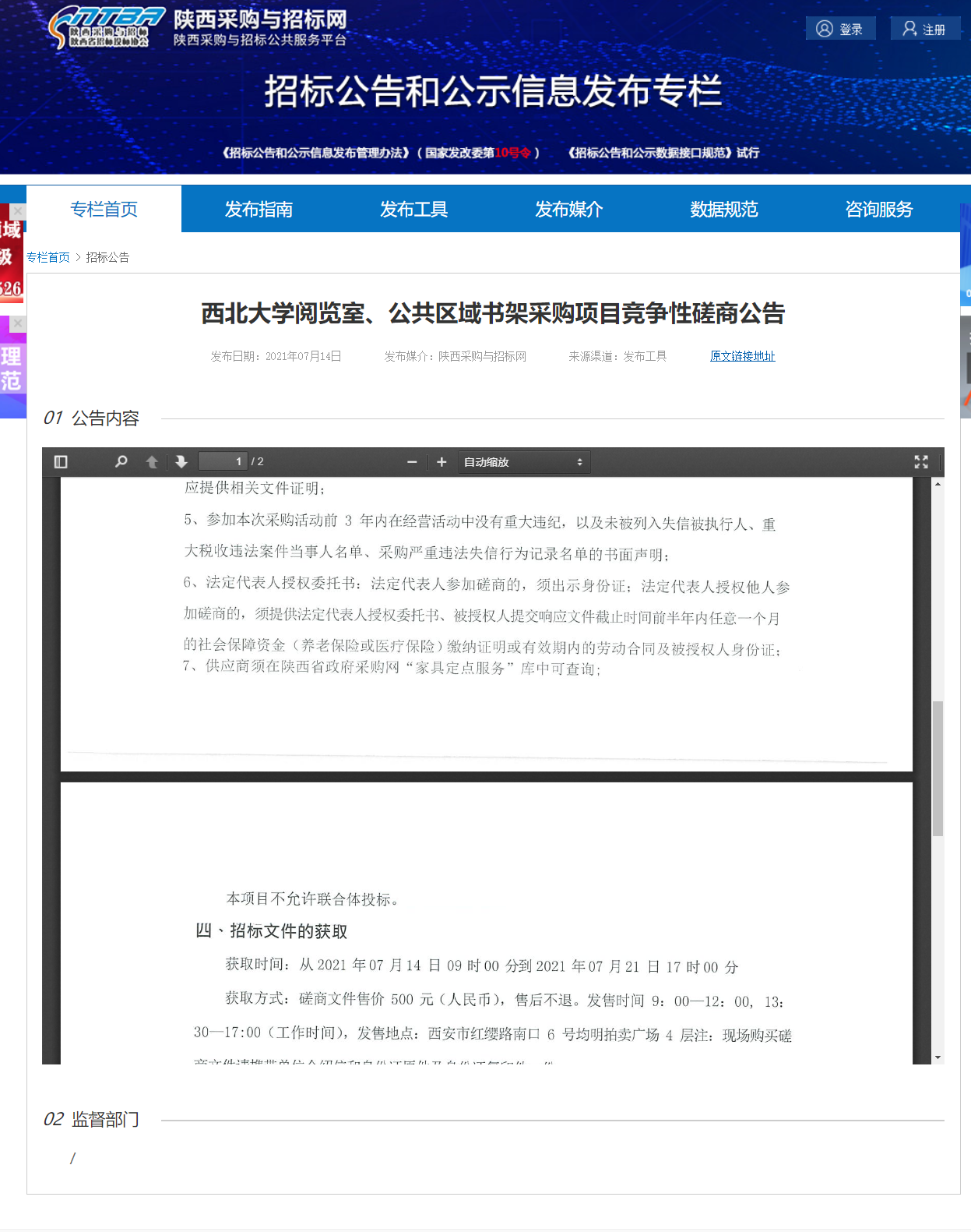 乐鱼网页版页面登录阅览室、公共区域书架采购项目竞争性磋商公告 作者: 编辑:采购与招标办公室 时间:2021-07-15 原公告地址:http://bulletin.sntba.com/biddingBulletin/2021-07-14/318895.html
