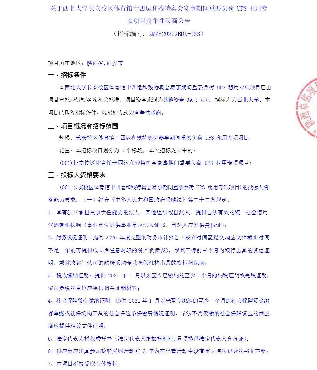关于乐鱼网页版页面登录长安校区体育馆十四运和残特奥会赛事期间重要负荷UPS租用专项项目竞争性磋商公告