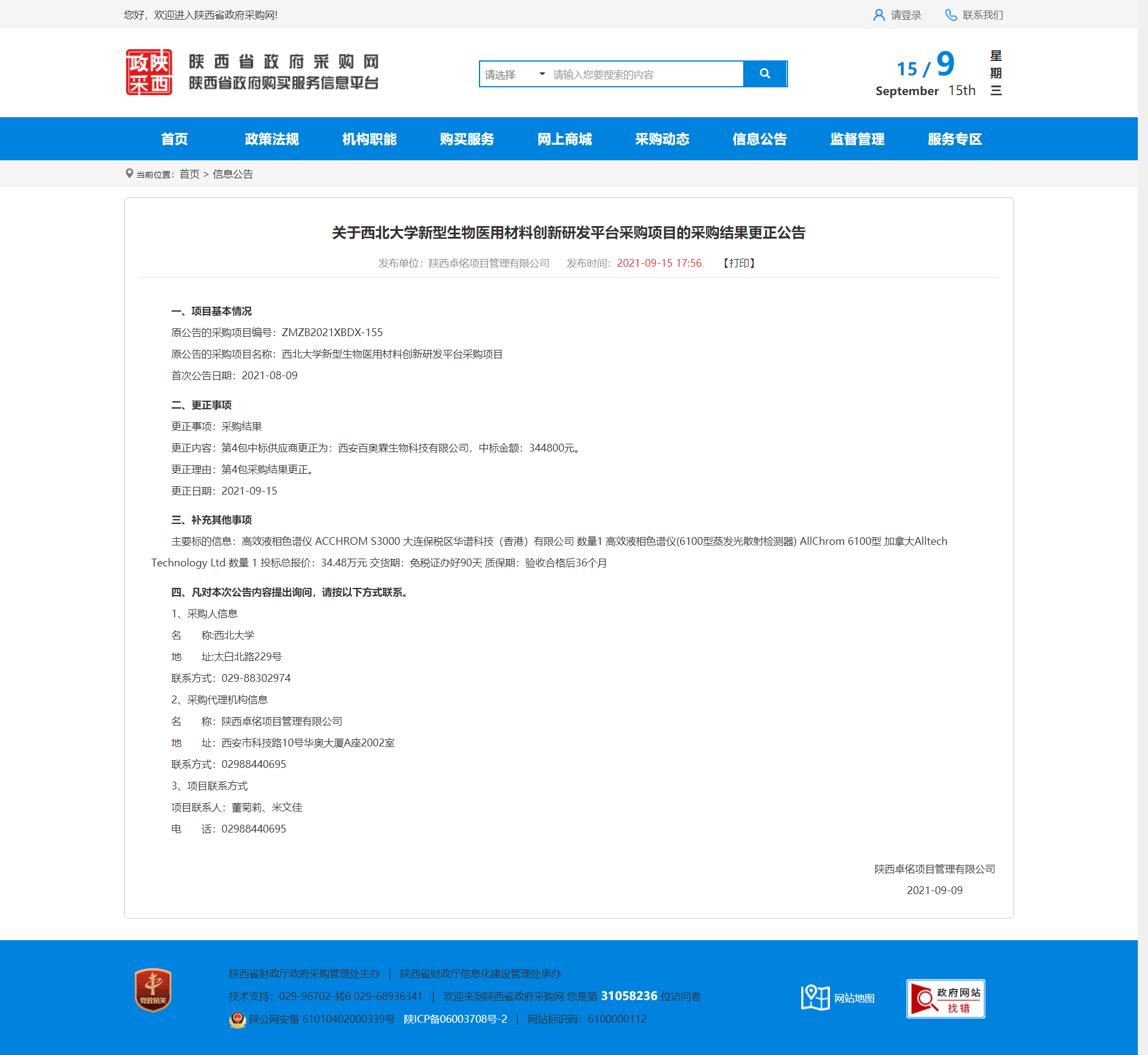 关于乐鱼网页版页面登录新型生物医用材料创新研发平台采购项目的采购结果更正公告 作者: 编辑:采购与招标办公室 时间:2021-09-15 原公告地址:http://www.ccgp-shaanxi.gov.cn/notice/noticeDetail.do?noticeguid=8a85be347bc00296017be8d43def369b