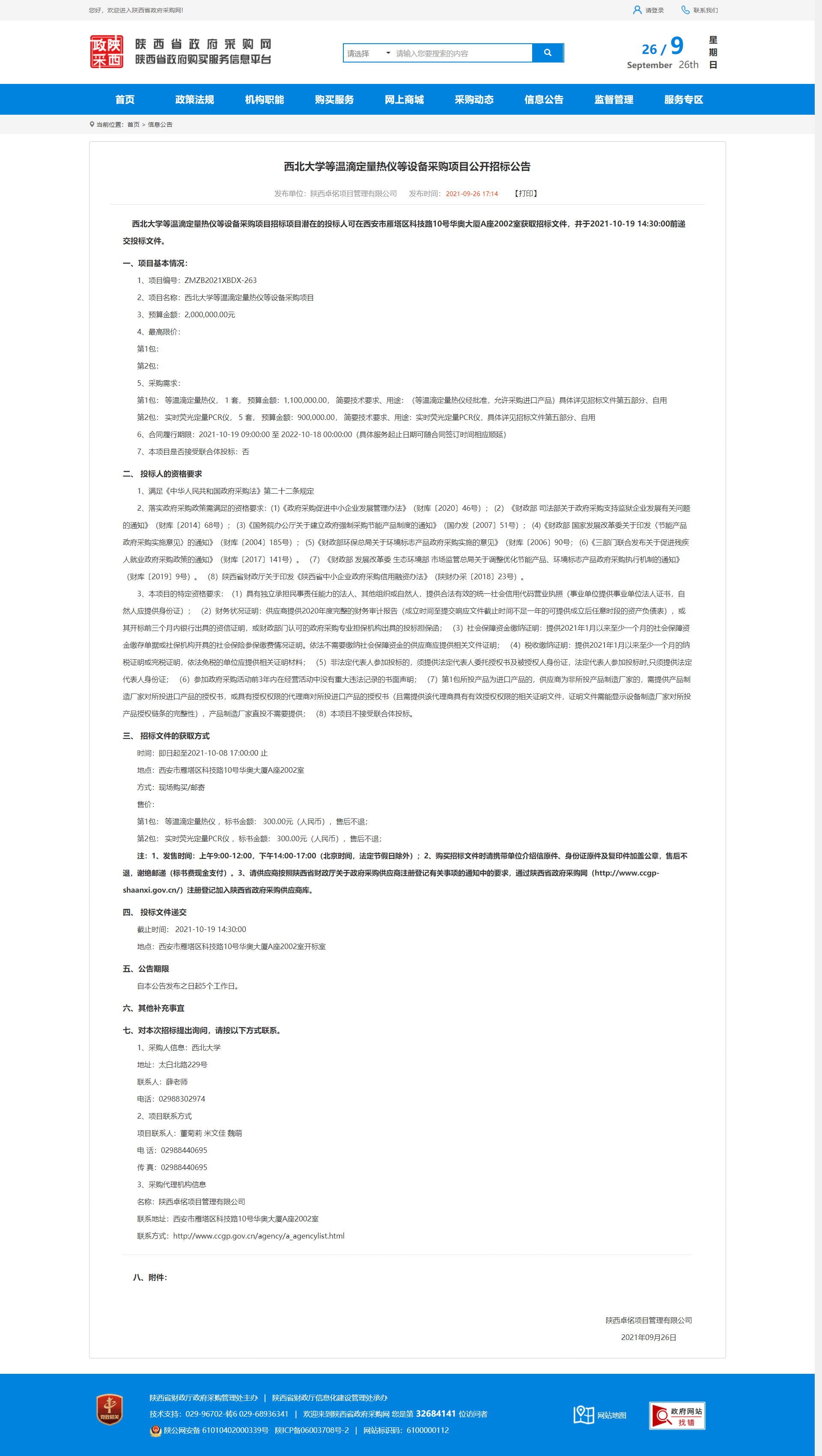 乐鱼网页版页面登录等温滴定量热仪等设备采购项目公开招标公告 作者: 编辑:采购与招标办公室 时间:2021-09-26 原公告地址:http://www.ccgp-shaanxi.gov.cn/notice/noticeDetail.do?noticeguid=8a85be317c20d707017c21545fc51220
