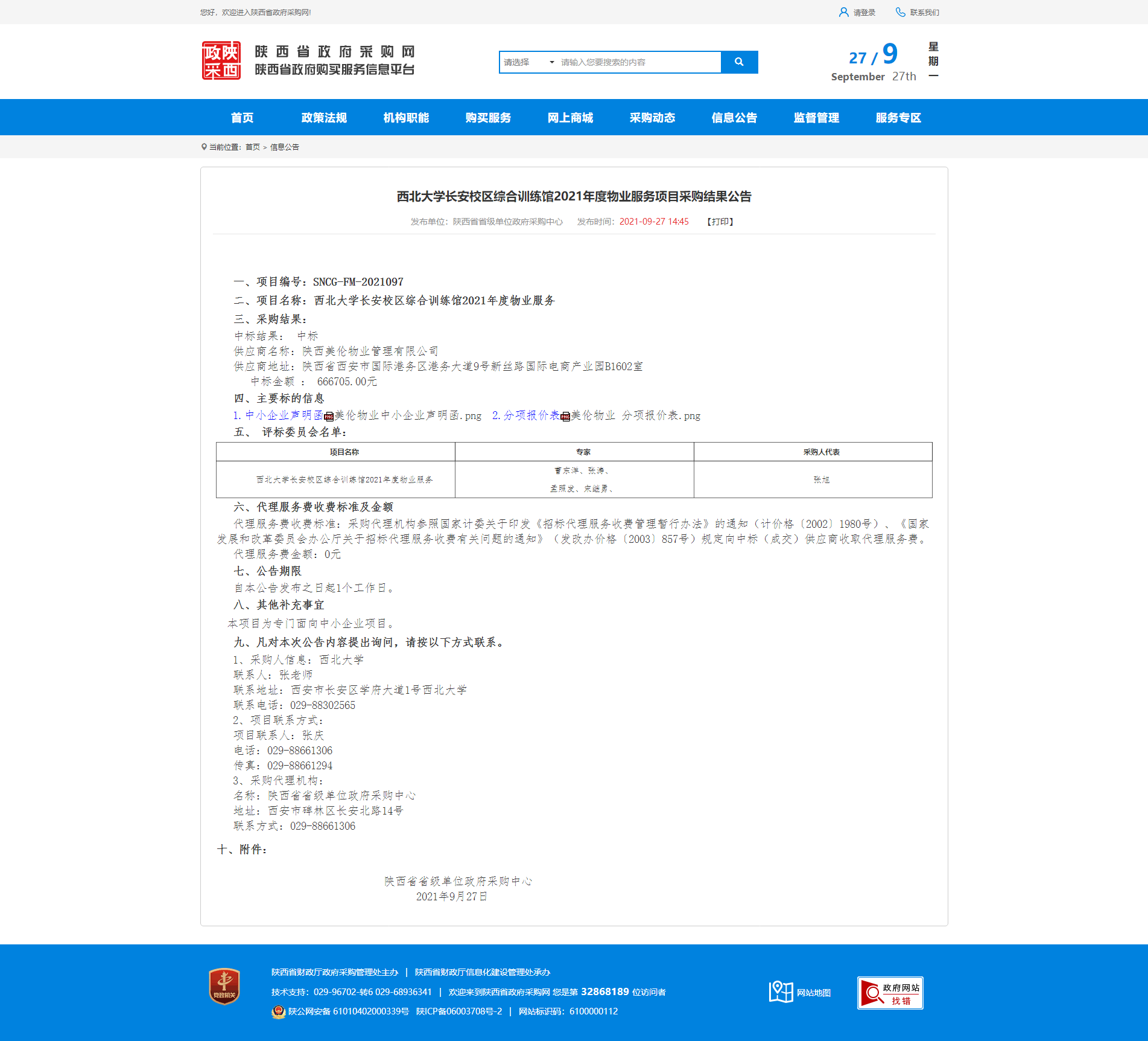 关于乐鱼网页版页面登录长安校区综合训练馆2021年度物业服务项目采购结果公告