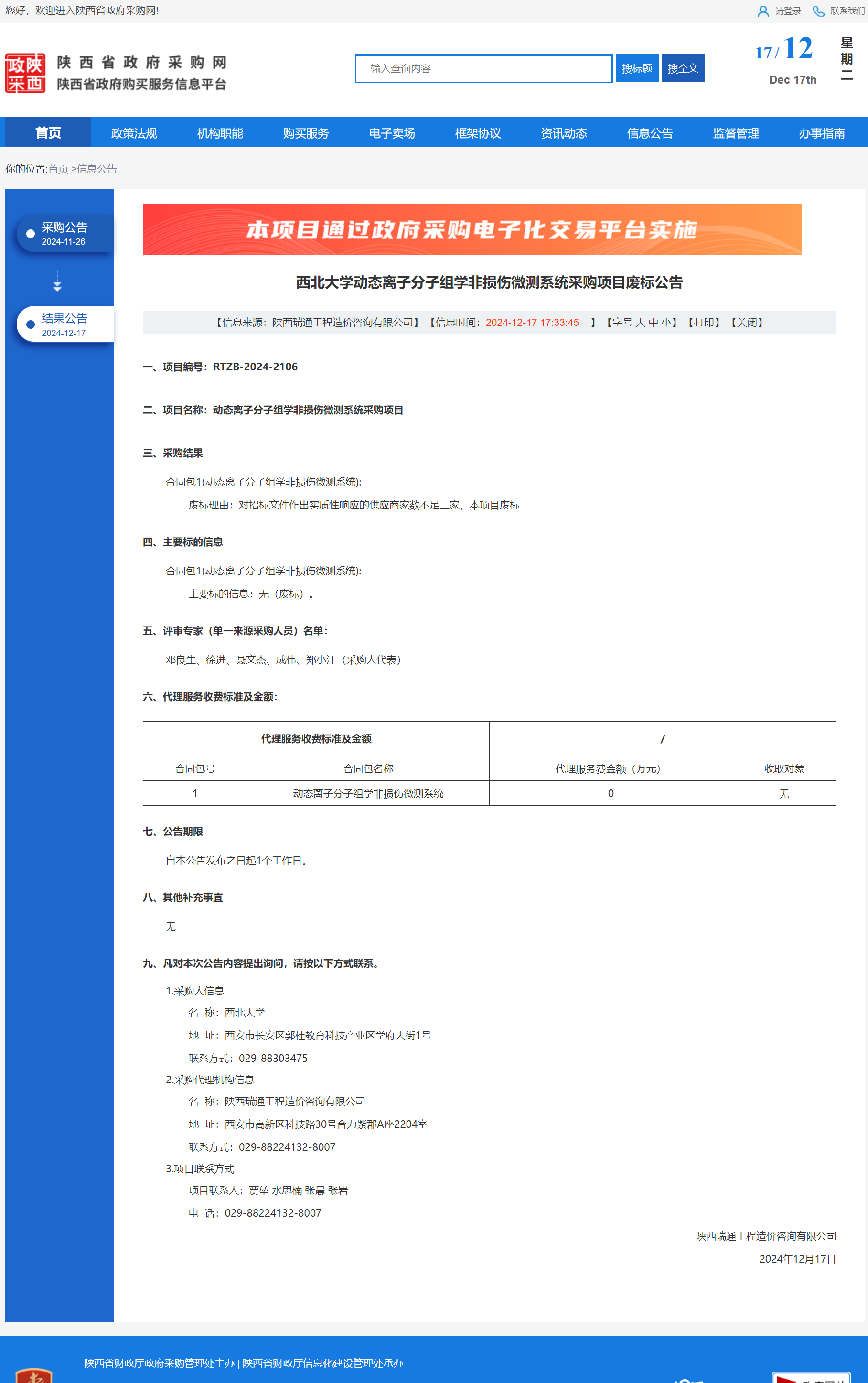 乐鱼网页版页面登录动态离子分子组学非损伤微测系统采购项目废标公告 作者:采购与招标办公室 编辑: 时间:2024-12-17 原公告链接:http://www.ccgp-shaanxi.gov.cn/freecms/site/shaanxi/ggxx/info/2024/8a69c5a59218576d0193d3ef8a485b79.html?noticeType=001006¬iceId=a477f0fe-bc5b-11ef-8063-08c0eb20c666