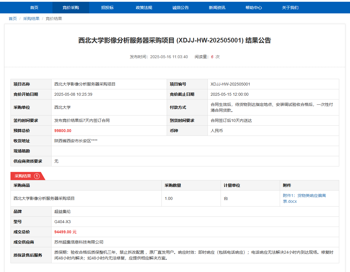 乐鱼网页版页面登录影像分析服务器采购项目(XDJJ-HW-202505001)竞价结果公告 作者:采购与招标办公室 编辑: 时间:2025-05-16 原公告链接:https://www.ejingcai.com.cn/site/bidding/detail/18256