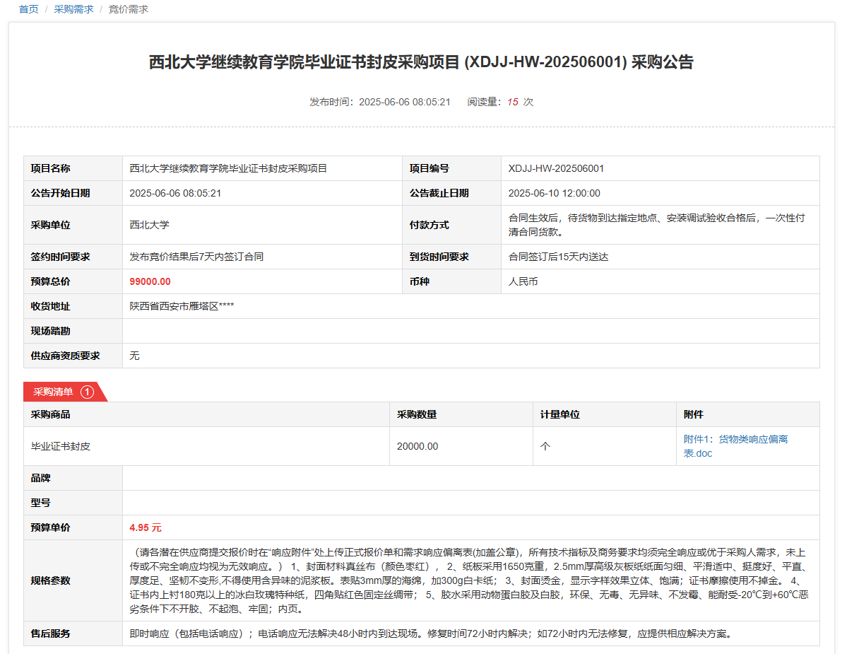 乐鱼网页版页面登录继续教育学院毕业证书封皮采购项目(XDJJ-HW-202506001)竞价采购公告 作者:采购与招标办公室 编辑: 时间:2025-06-06 原公告链接:https://www.ejingcai.com.cn/site/bidding/detail/18697