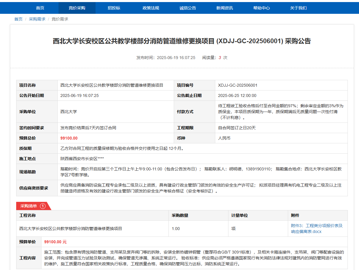 乐鱼网页版页面登录长安校区公共教学楼部分消防管道维修更换项目(XDJJ-GC-202506001)竞价采购公告 作者:采购与招标办公室 编辑: 时间:2025-06-19 原公告链接:https://www.ejingcai.com.cn/site/bidding/detail/19038