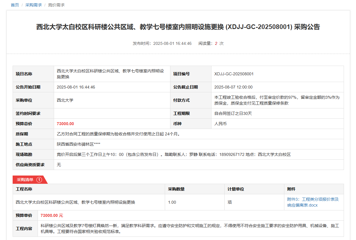 乐鱼网页版页面登录太白校区科研楼公共区域、教学七号楼室内照明设施更换(XDJJ-GC-202508001)竞价采购公告