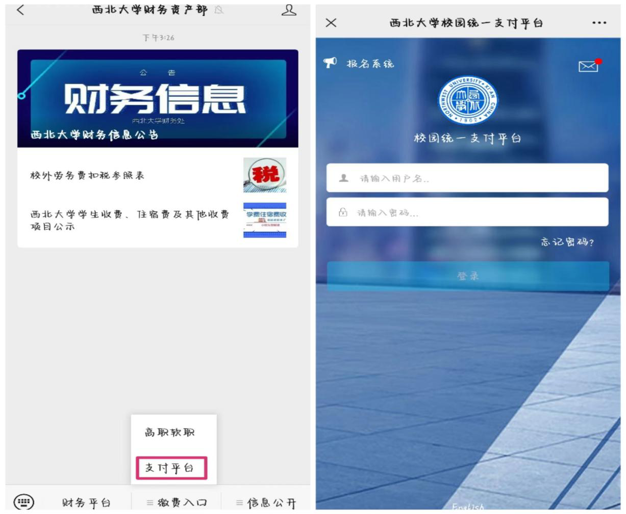 手机端:关注“乐鱼网页版页面登录财务资产部”微信公众号,选择“缴费入口”点击“支付平台”进入。(见下图)