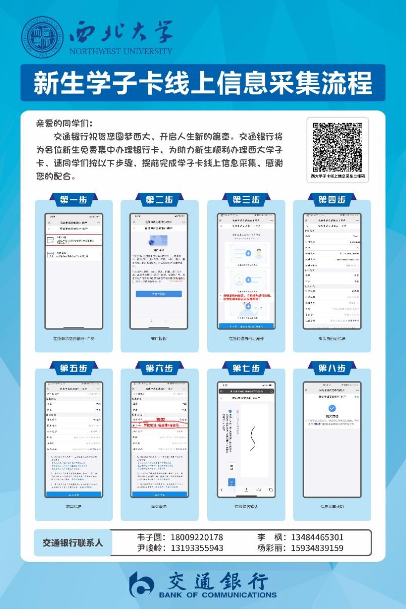 (一)学子卡线上信息采集:9月1日8:00到9月8日24:00,新生扫码在线申请交行学子卡,在线扫描身份证原件,填写个人信息,签名确认,完成线上信息采集。