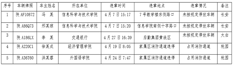 2023年4月份校园交通违章曝光 作者: 编辑: 时间:2023-05-10 为加强校内道路交通管理,规范校内交通秩序,根据《乐鱼网页版页面登录校园道路交通管理办法》的通知要求,现将2023年4月校园交通违章车辆曝光如下。 希望广大师生员工遵守校园道路交通管理办法,维护校园交通安全,共同营造良好的校园交通秩序。 乐鱼网页版页面登录道路交通安全委员会 2023年5月10日