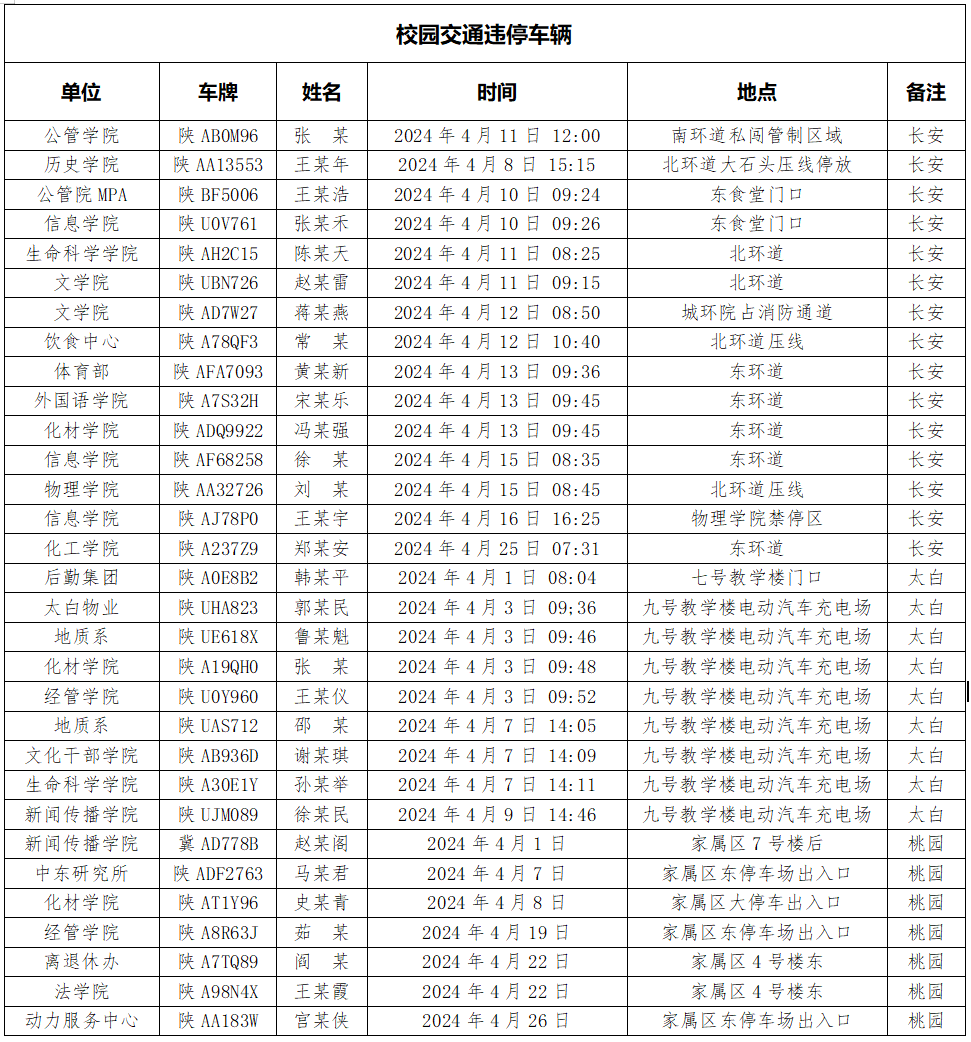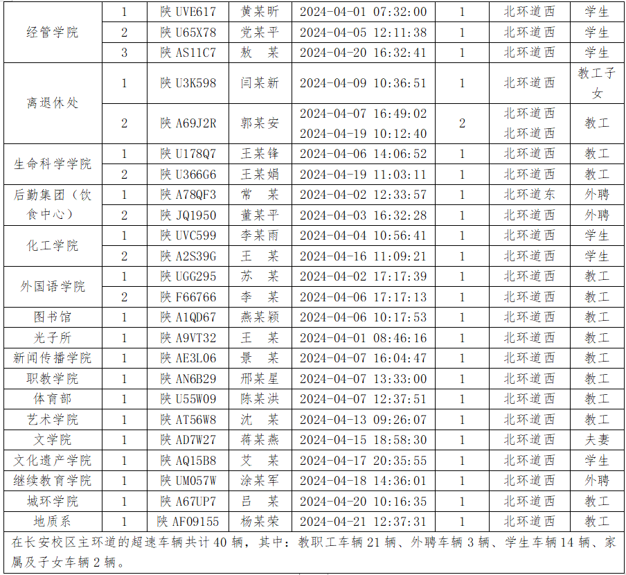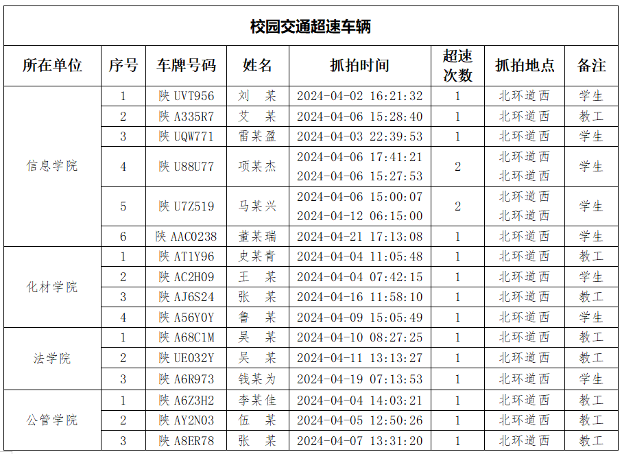 为加强校内道路交通安全管理,规范校内交通秩序,根据《乐鱼网页版页面登录校园道路交通管理办法》有关要求,现将2024年4月校园交通违章车辆予以曝光,4月份教工超速车辆占52%、学生超速车辆占35%、外聘职工及教工家属车辆占12%,请所在单位加强对本单位违章师生员工的教育和管理,对于校内曝光超速的学生车辆将取消下一年度的通行证办理资格。