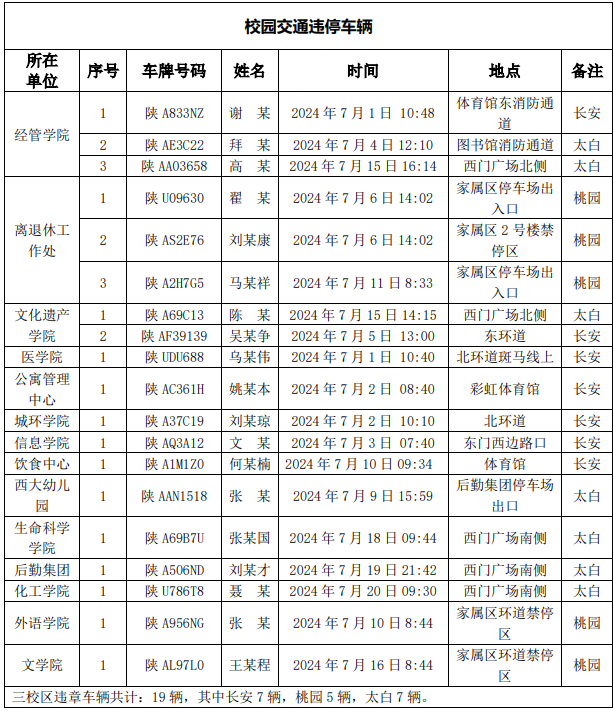 为一步加强校园交通管理,保障校园交通安全有序,维护学校正常的教学、科研和生活秩序以及师生员工的人身财产安全,根据《乐鱼网页版页面登录校园交通安全管理规定》有关要求, 现将2024年7月校园交通违章车辆予以曝光,具体情况如下表。