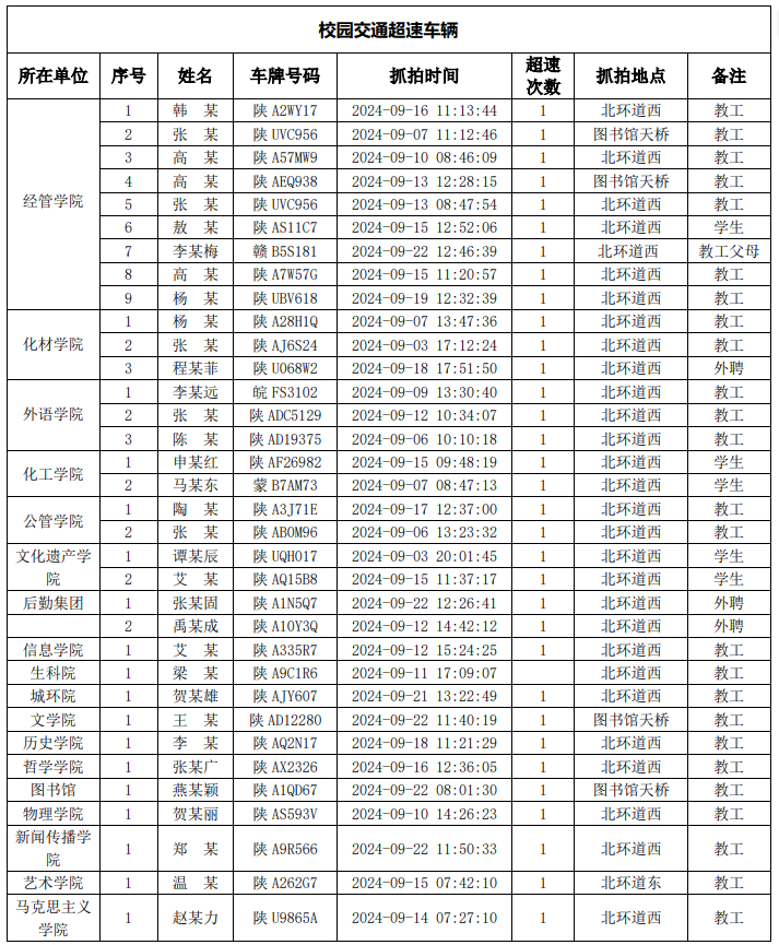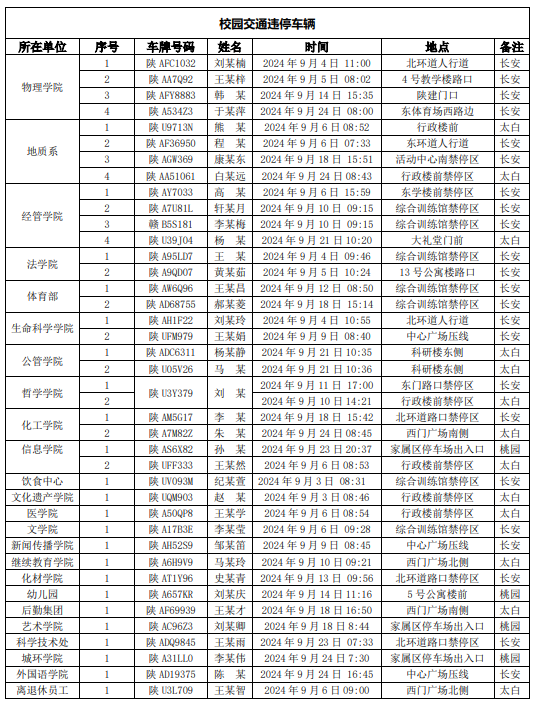 为一步加强校园交通管理,保障校园交通安全有序,维护学校正常的教学、科研和生活秩序以及师生员工的人身财产安全,根据《乐鱼网页版页面登录校园交通安全管理规定》有关要求, 现将2024年9月校园交通违章车辆予以曝光,具体情况如下表。