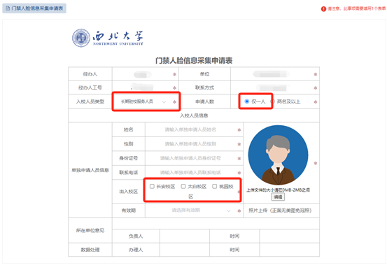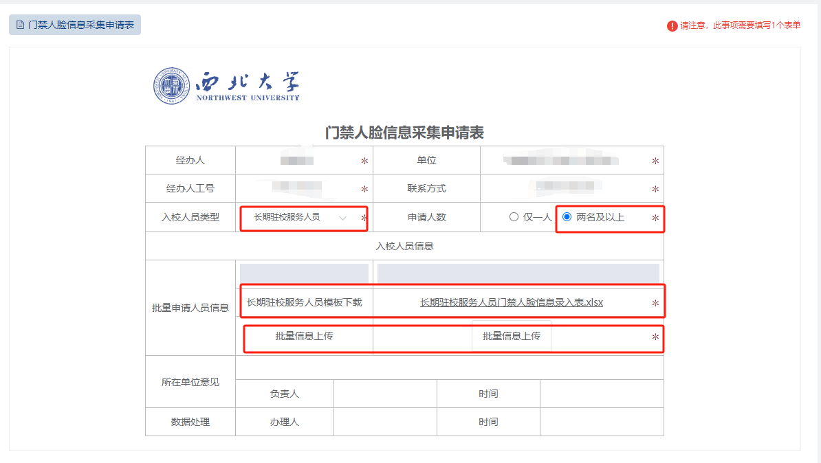 2.填写内容。申请单位、经办人信息、入校人员信息、入校人员类型(包括家属、长期驻校服务人员)、申请人数(包括仅1人、两人及以上)、人员模板下载(选择两人及以上时,教职工家属需要下载并上传《教职工家属门禁人脸信息录入表》、长期驻校服务人员需要下载并上传《长期驻校服务人员门禁人脸信息录入表》)等信息。