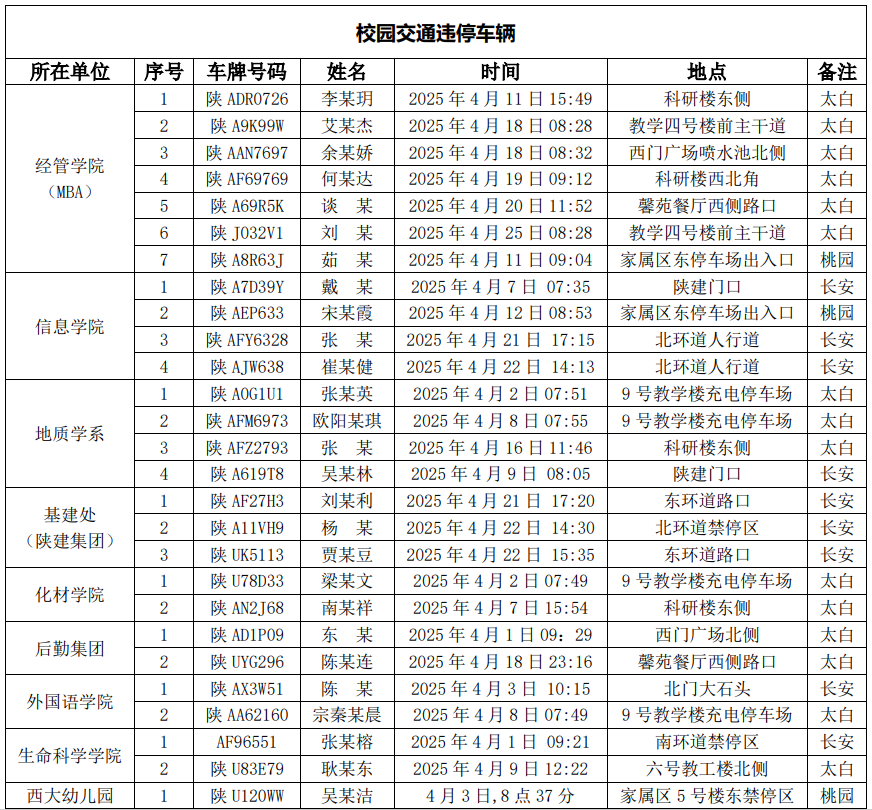 为进一步加强校园交通管理,保障校园交通安全有序,维护学校正常的教学、科研和生活秩序,切实保护师生员工的人身财产安全,根据《乐鱼网页版页面登录校园交通安全管理规定》的相关要求,现将2025年4月校园交通违章车辆予以曝光,具体要求与违章信息如下: