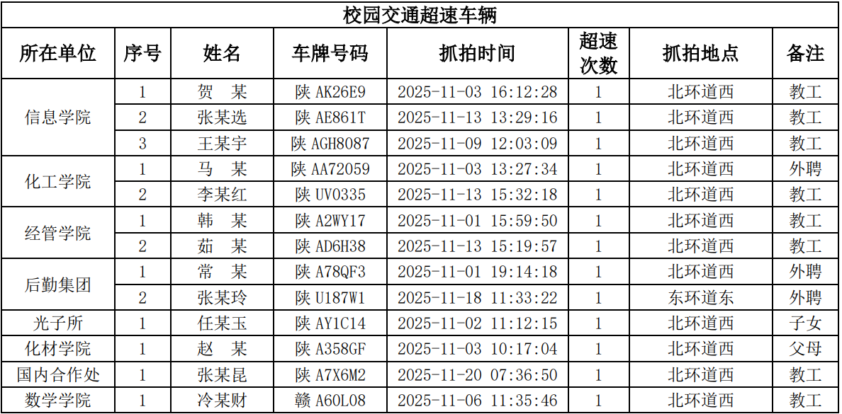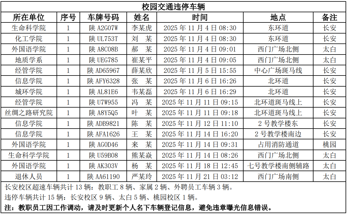为进一步加强校园交通管理,保障校园交通安全有序,维护学校正常的教学、科研和生活秩序,切实保护师生员工的人身财产安全,根据《乐鱼网页版页面登录校园交通安全管理规定》的相关要求,现将2025年11月校园交通违章车辆予以曝光,具体要求与违章信息如下: