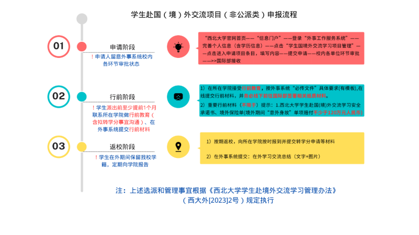 3. 申请学生在确定录取后,应及时履行出国(境)前相关行前手续。请务必了解有关本项目学生的申请、行前、返校阶段情况说明,请见附件3 申报流程说明或下图。