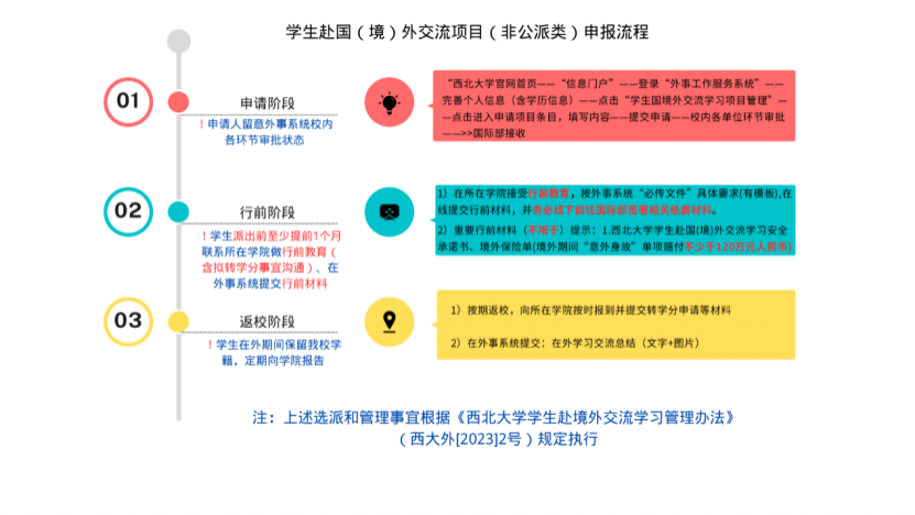 3. 申请学生在确定录取后,应及时履行出国(境)前相关行前手续。请务必了解有关本项目学生的申请、行前、返校阶段情况说明,请见下图。