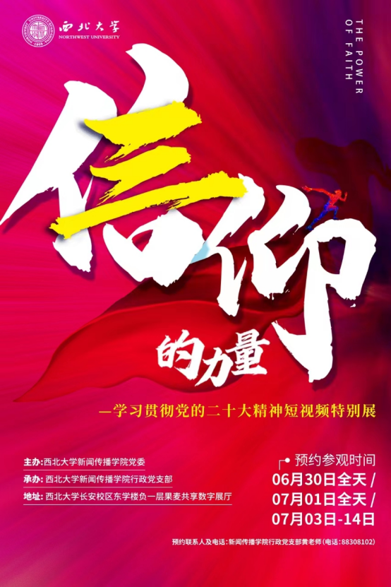为庆祝中国共产党成立102周年、学习贯彻党的二十大精神,由乐鱼网页版页面登录新闻传播学院党委主办、行政党支部承办的《信仰的力量——学习贯彻党的二十大精神短视频特别展》定于七一建党节前后在果麦共享数字展厅(乐鱼网页版页面登录长安校区东学楼负1层)举办。本项展览不仅可供党员参观学习,也可为党支部开展有关主题党日活动、学习二十大精神、重温入党誓词提供适宜的活动场景。本学期展出时间为6月30日—7月1日、7月3日-7月14日,主要面向乐鱼网页版页面登录院系党委或教职工党支部接受预约参观、开展七一建党节党日主题活动;下学期开学后将面向乐鱼网页版页面登录学生党支部预约参观,并可安排党员志愿者讲解。